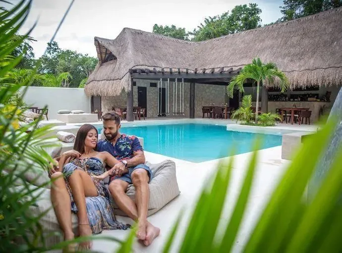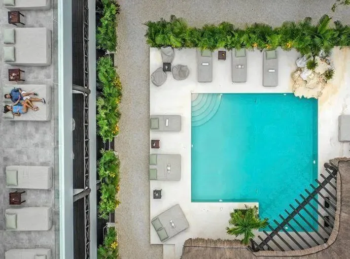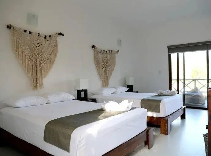 This boutique hotel villa consists of 6 custom-made suites decorated with local crafts and a Tulum aesthetic. Each suite has an en-suite bathroom, a terrace, air conditioning, and views of the pool. The configuration includes 4 King Size Suites for two guests and 2 Double Suites for four guests, providing a total standard capacity for 16 guests. The capacity can be expanded to accommodate 20 to 24 guests with additional beds.