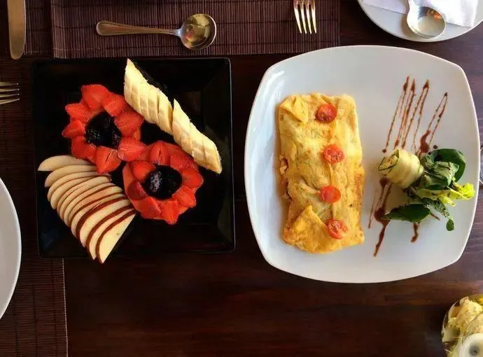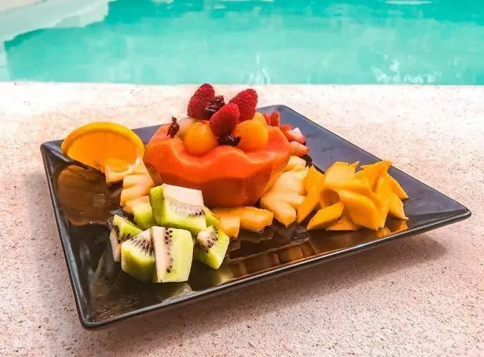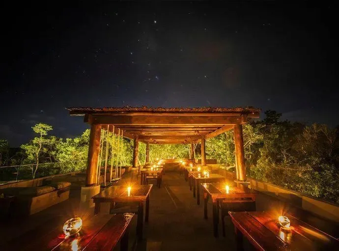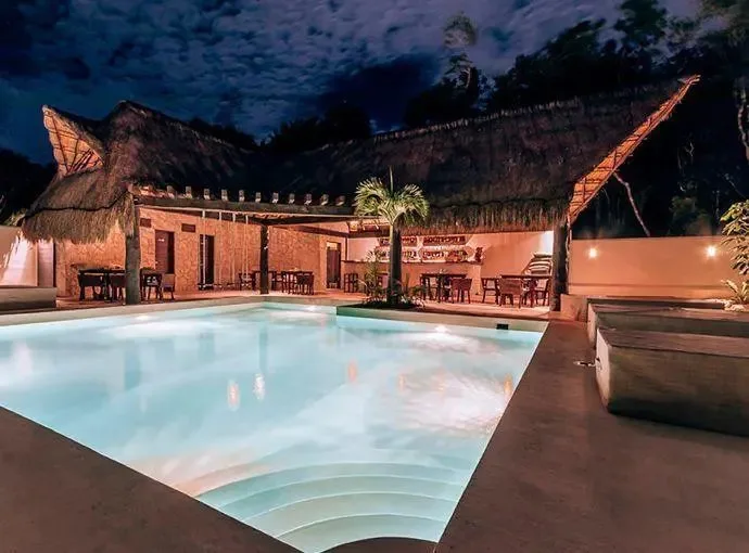The property features a restaurant and bar under a main palapa structure, offering breakfast, lunch, dinner, and drinks. Common areas include a swimming pool, a rooftop, and lounge areas. The facility can host events such as weddings, birthdays, and anniversary parties for up to 80 guests. A cenote named Xunaan Ha is located approximately 200 meters away; it is an open cenote that connects with 52km of underground caves and serves as a diver sanctuary.