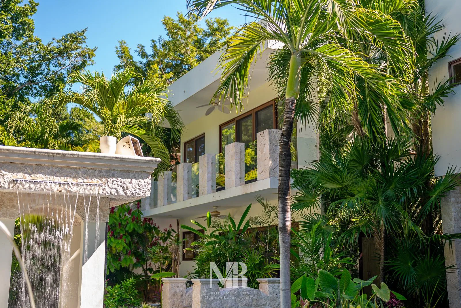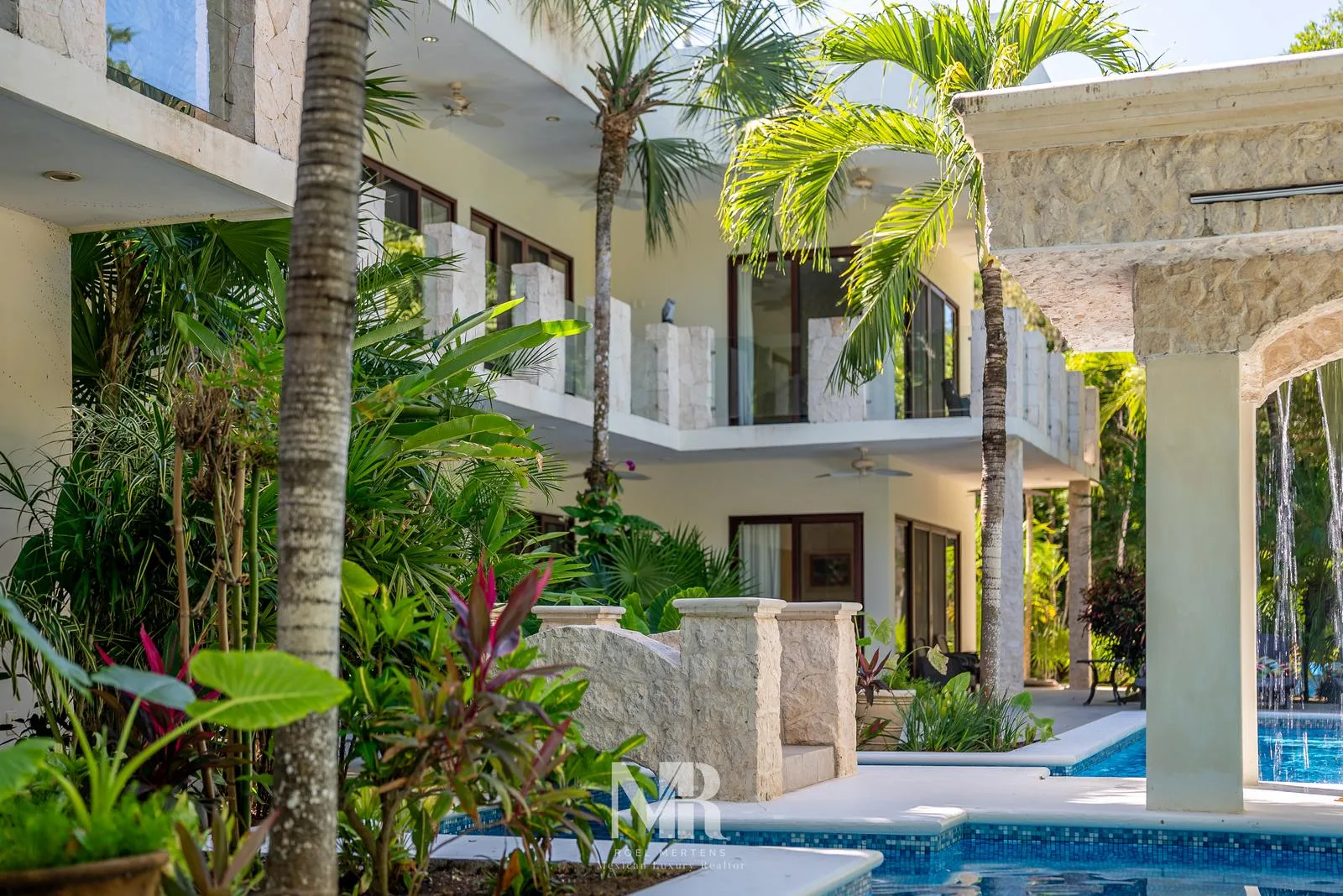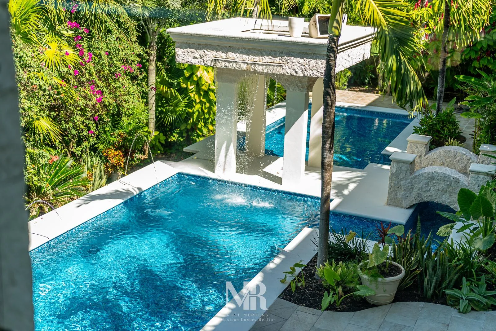 The most striking feature is the backyard, which includes a wide terrace for entertainment surrounded by carefully designed tropical gardens that provide privacy and glimpses of the golf course fairway. The large central pool features a stone arch with a 3-meter waterfall.
