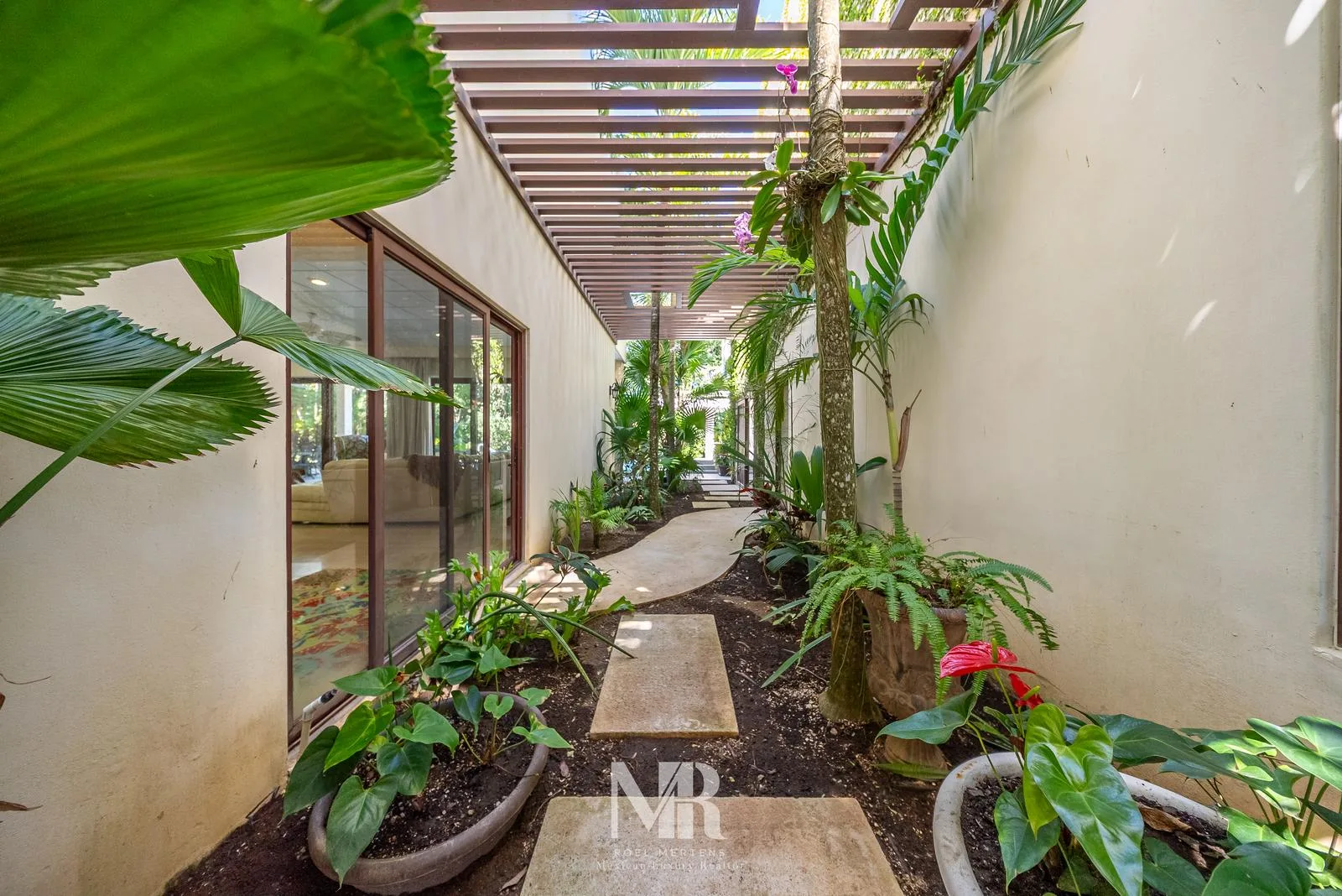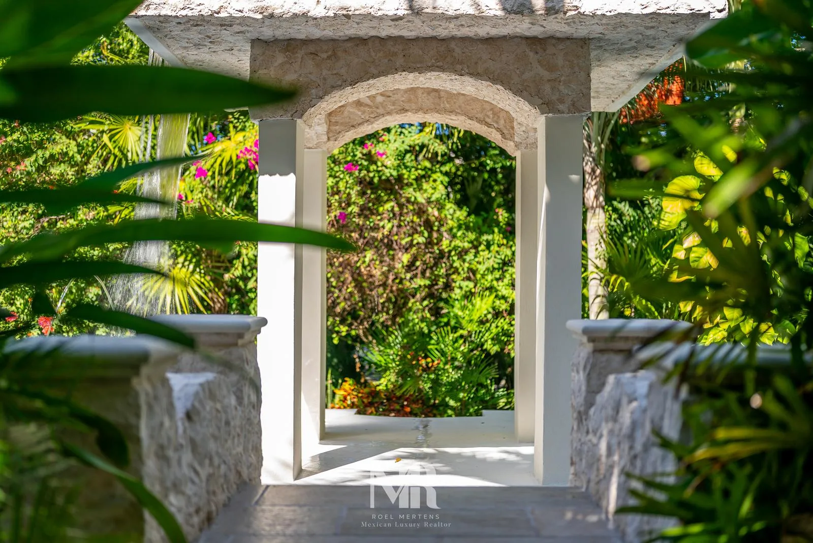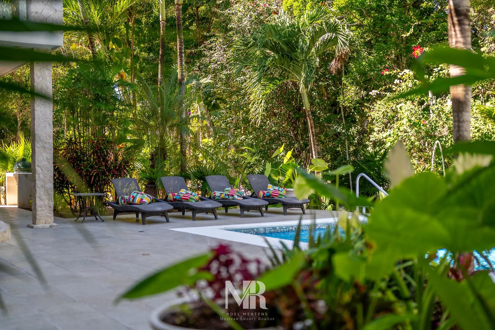 The most striking feature is the backyard, which includes a wide terrace for entertainment surrounded by carefully designed tropical gardens that provide privacy and glimpses of the golf course fairway. The large central pool features a stone arch with a 3-meter waterfall.