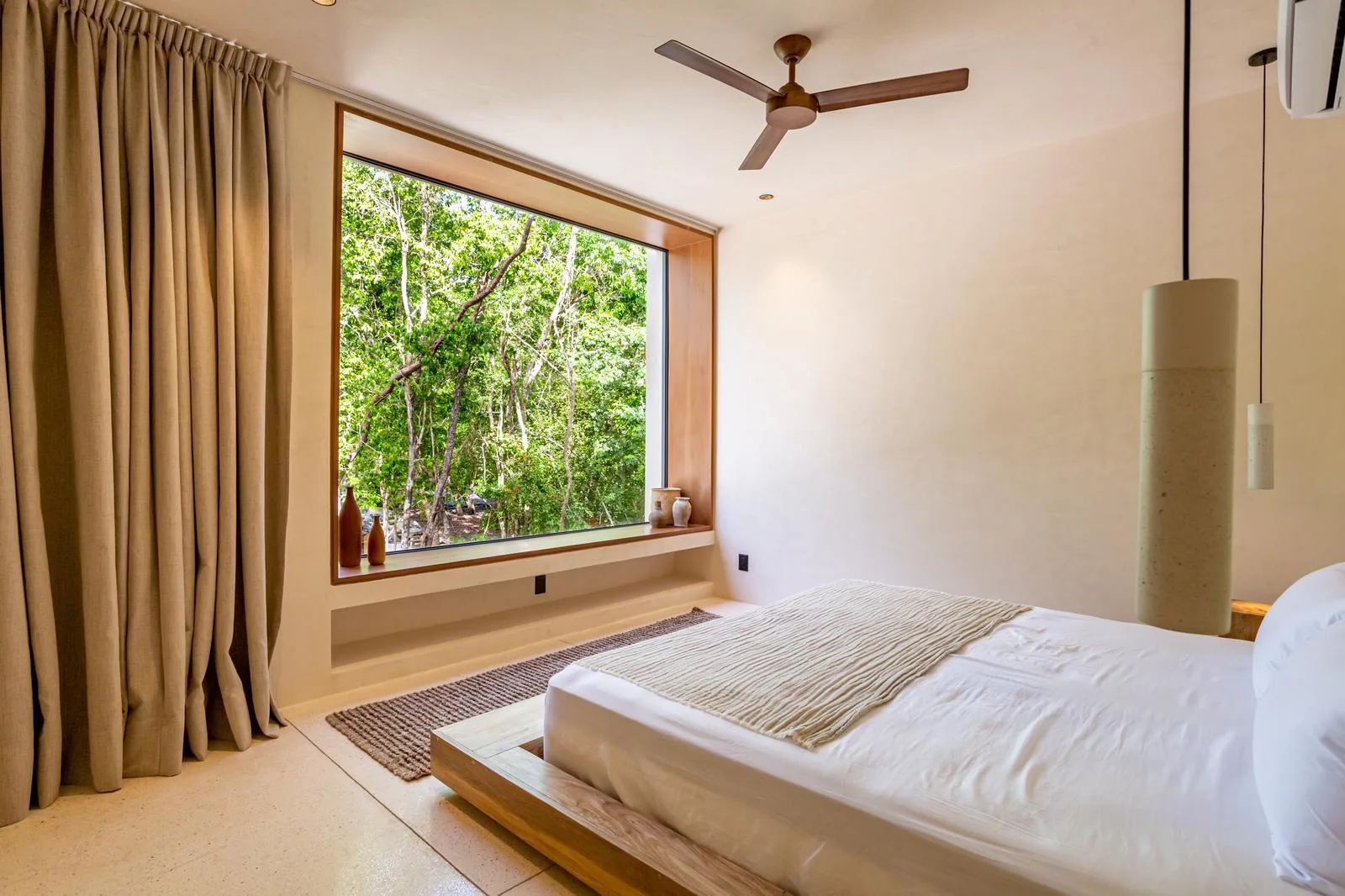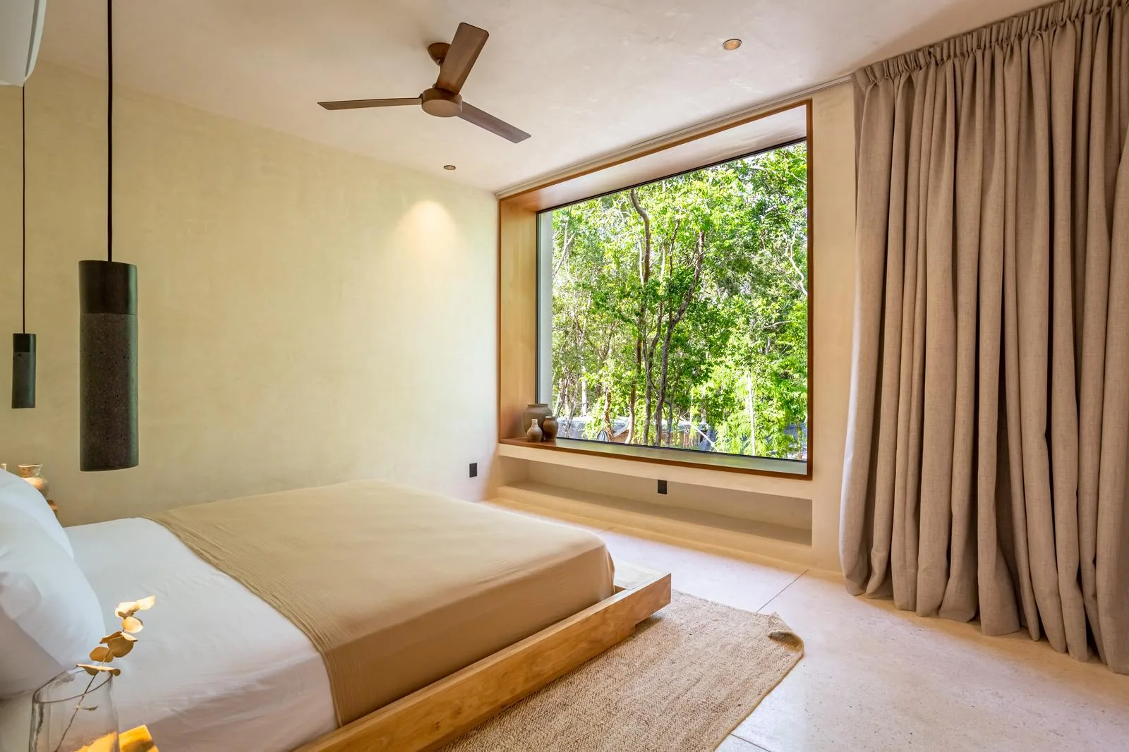 The master plan preserves over 50% of existing trees, maintaining Tulum's identity and providing interior spaces with views of jungle gardens, green corridors, and water features.