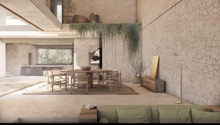 Notable features include a wine cellar and a service room with a private bathroom. The design incorporates an elegant central patio with a lounging area. A swimming pool is surrounded by lush gardens.
