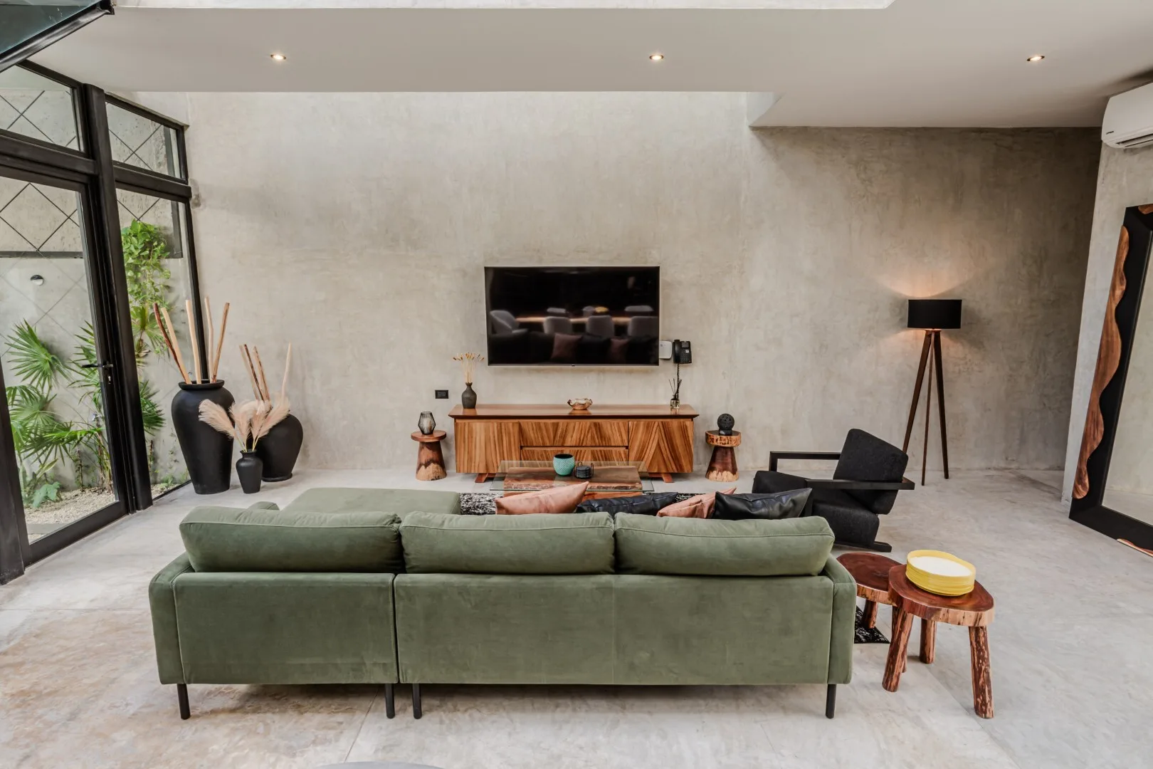 The architecture is thoughtfully crafted with attention to proportion, light, and texture. The home features double-height living spaces, walls of glass, and interior courtyards that create a dialogue between indoors and outdoors. Finishes include polished concrete surfaces, carved local stone, and rich tropical woods within a minimalist aesthetic.