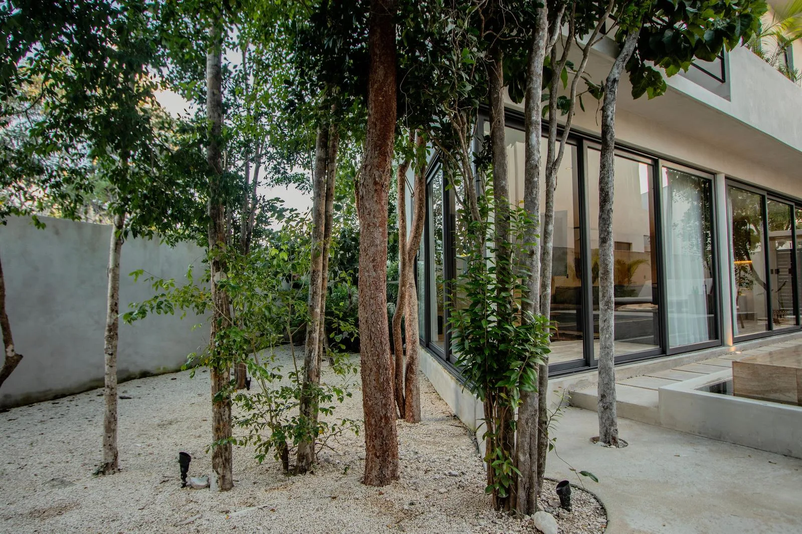 The development comprises four luxury villas featuring controlled access for privacy and security, set within the jungle environment of Tulum. The location offers proximity to the beach, approximately four minutes away.