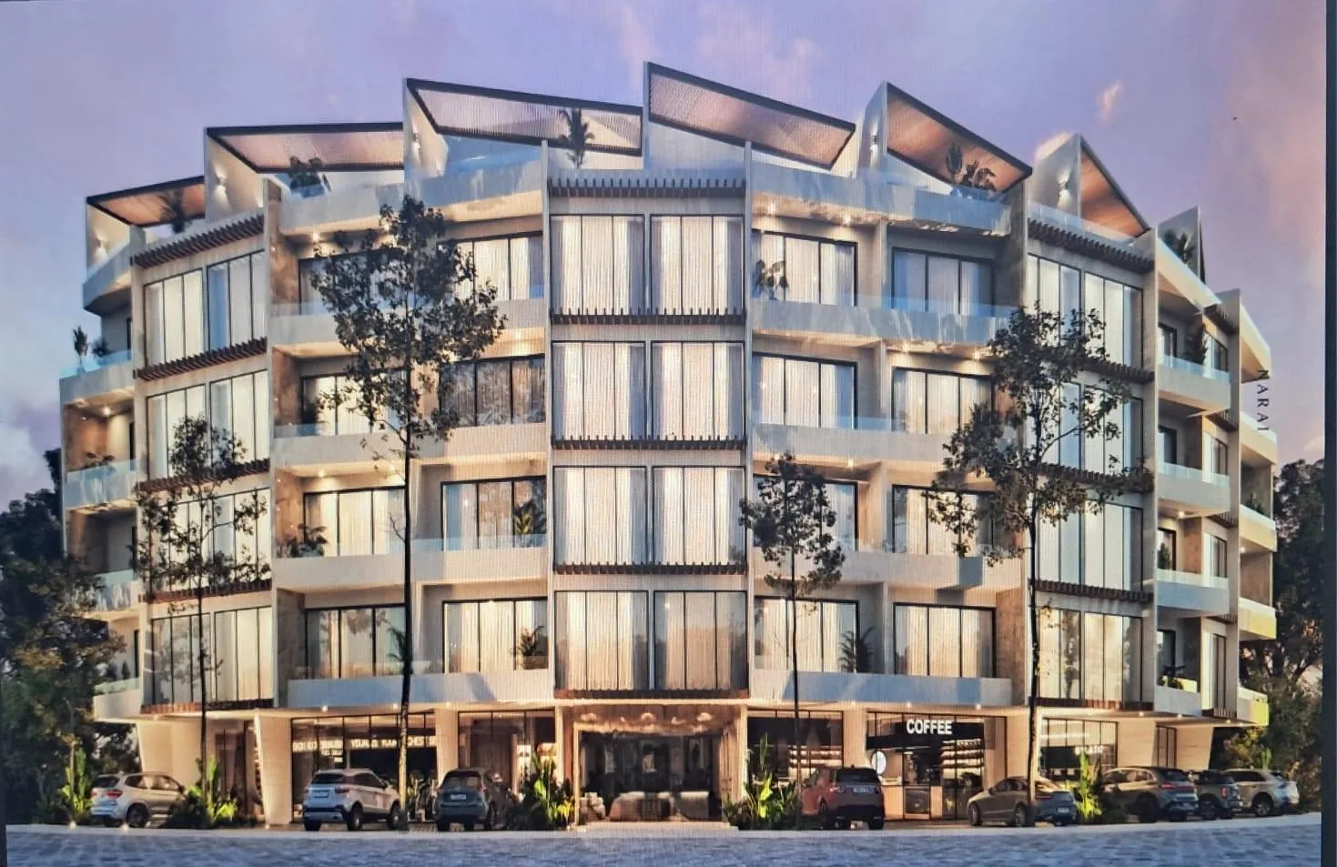 Amenities include a reception area, a ground-floor pool with a swimming lane and swim-up access, and a rooftop pool and solarium. Additional features are a jacuzzi, a fire pit, a private cinema, and a 100 square meter gym. The property includes commercial premises and offers access to local beach clubs.
