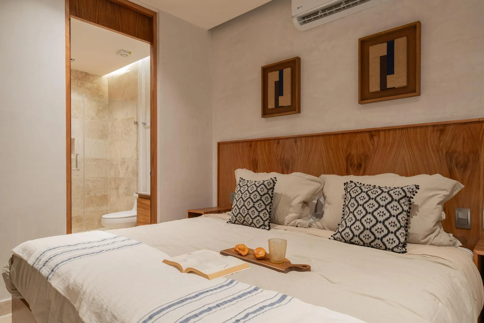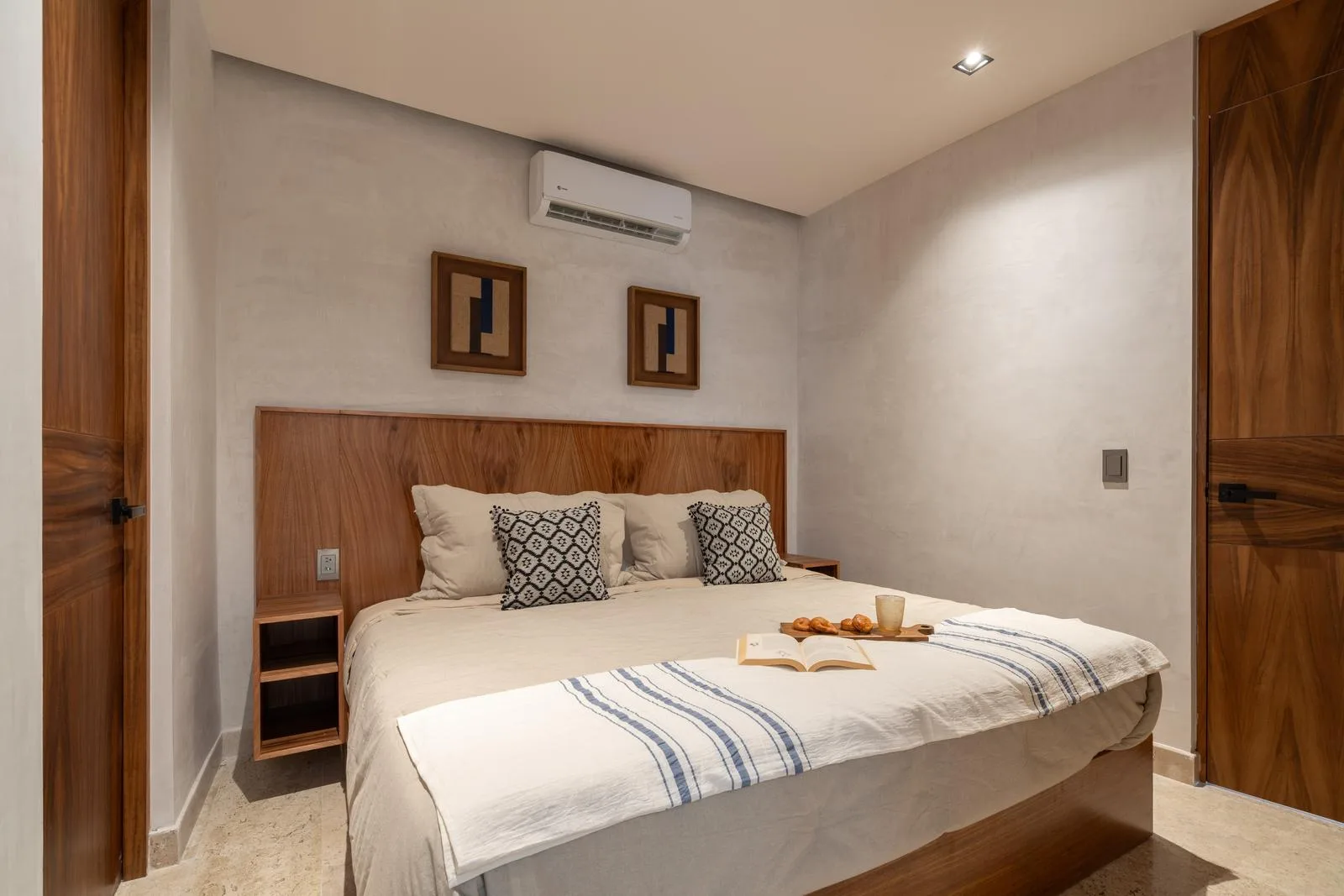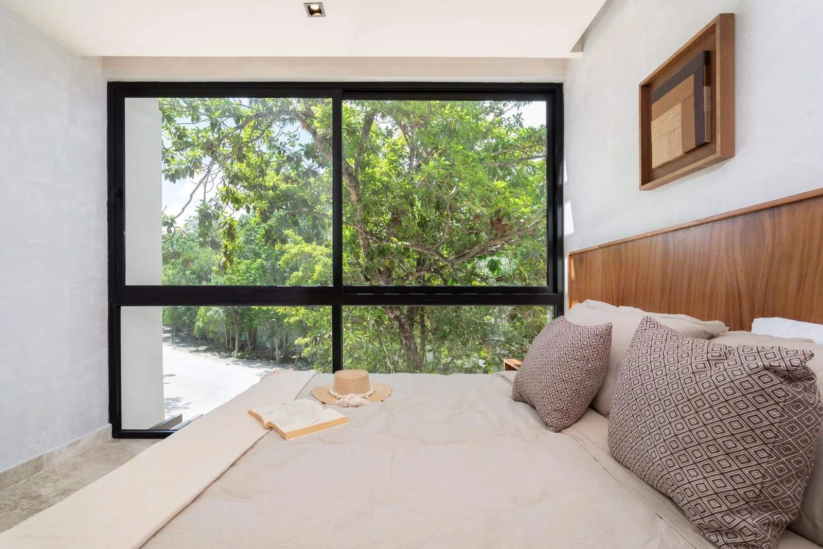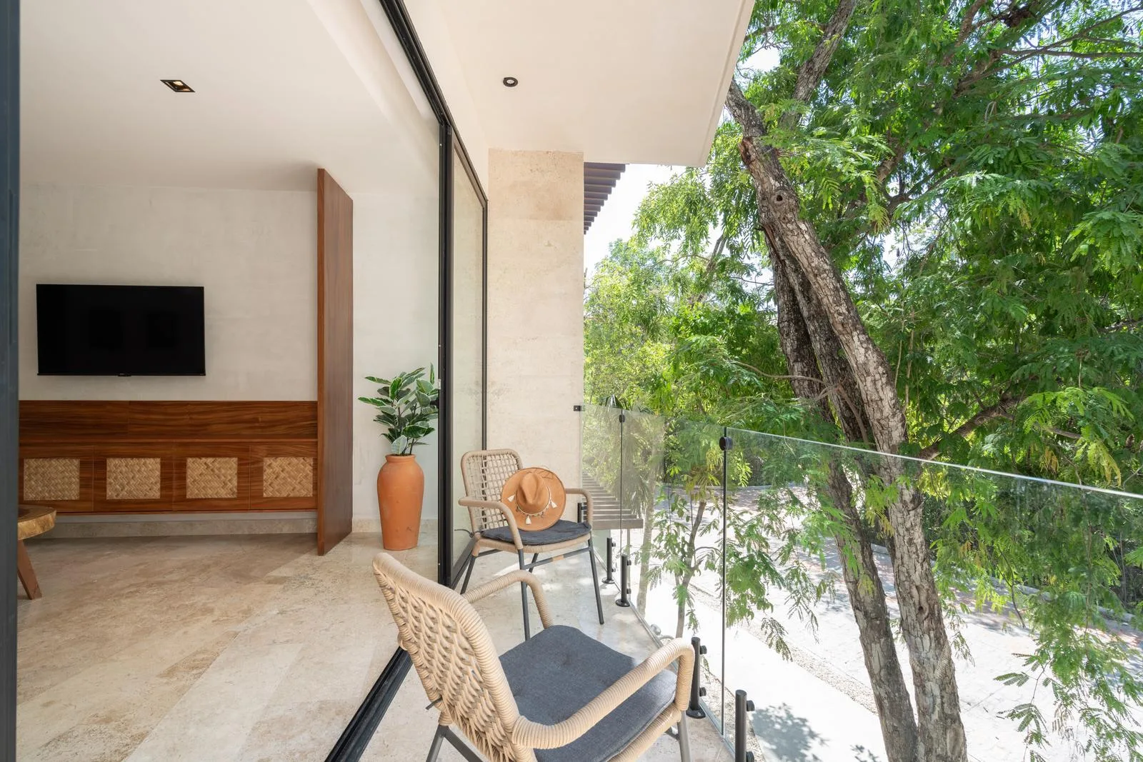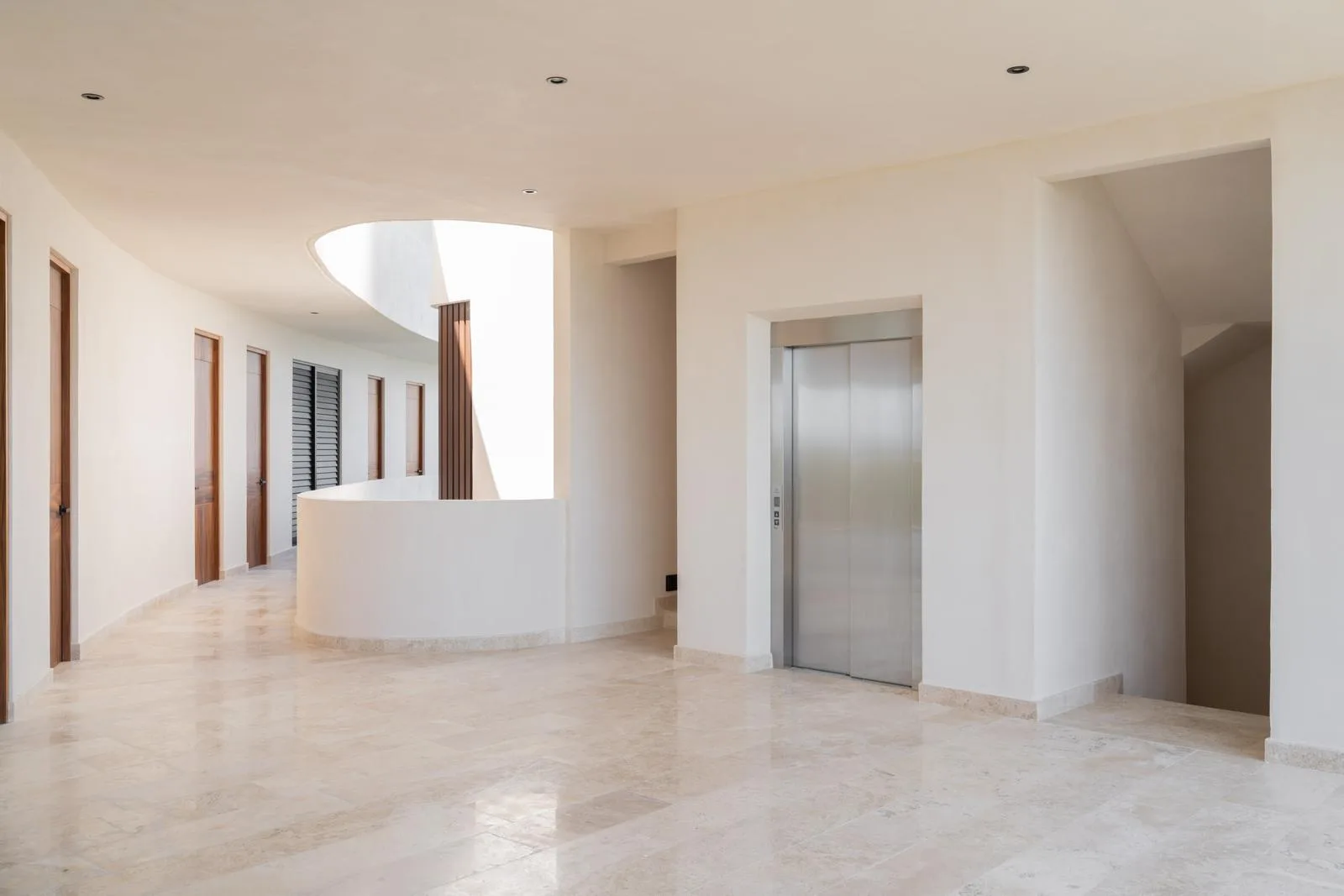 The architecture of this Tulum project features a unique circular facade with fluid lines that integrate harmoniously with the environment. Interior finishes include marble and wood, which create an atmosphere with warm and neutral tones. Spacious areas are illuminated by large windows and terraces designed to maximize light and nature.