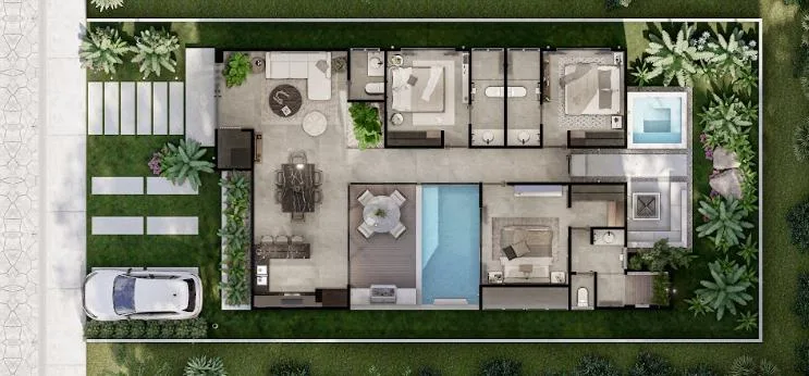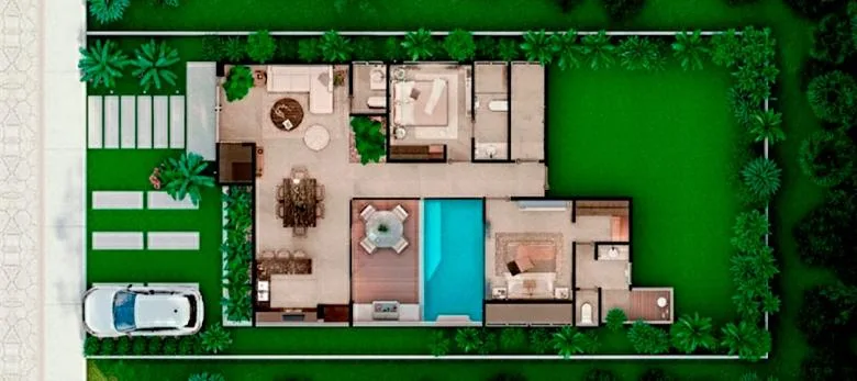 The properties feature spacious social and private areas with a modern and functional design. Each villa includes a private garden or terrace.