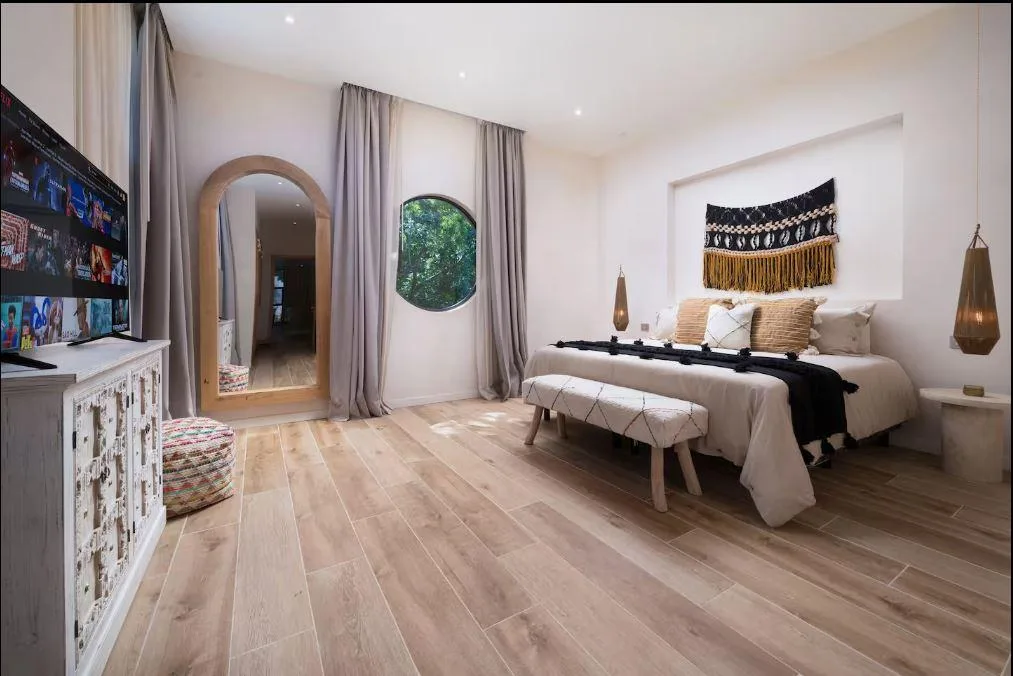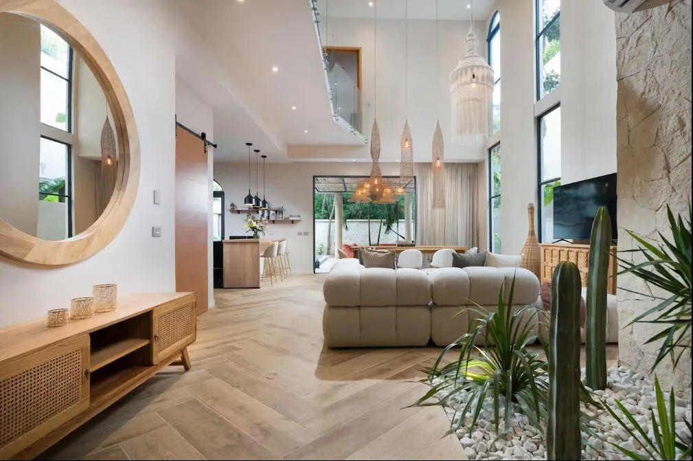 The villa features four bedrooms and four bathrooms. The layout includes one bedroom on the ground floor and three on the upper floor. It is sold fully furnished and tastefully decorated. The common spaces are inspired by Moroccan design, characterized by soft arches, natural materials, and a warm, welcoming atmosphere. The design emphasizes a seamless indoor-outdoor lifestyle, surrounded by natural light and tropical vegetation.