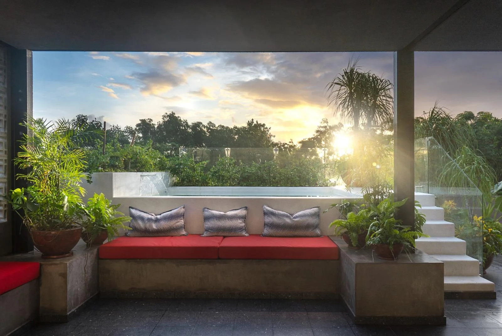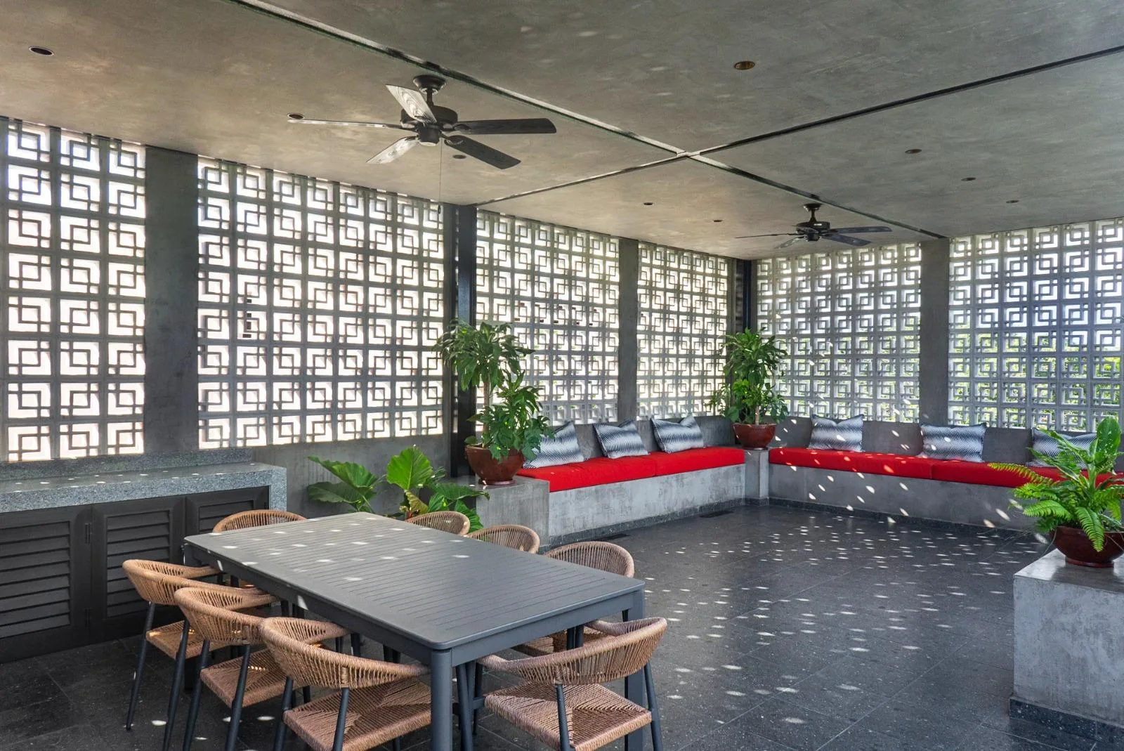 The third floor is dedicated to entertainment and relaxation. It features a large covered living area with a grill and an outdoor kitchen. Additionally, it includes a jacuzzi for 12 people with hydro-jets and heating.