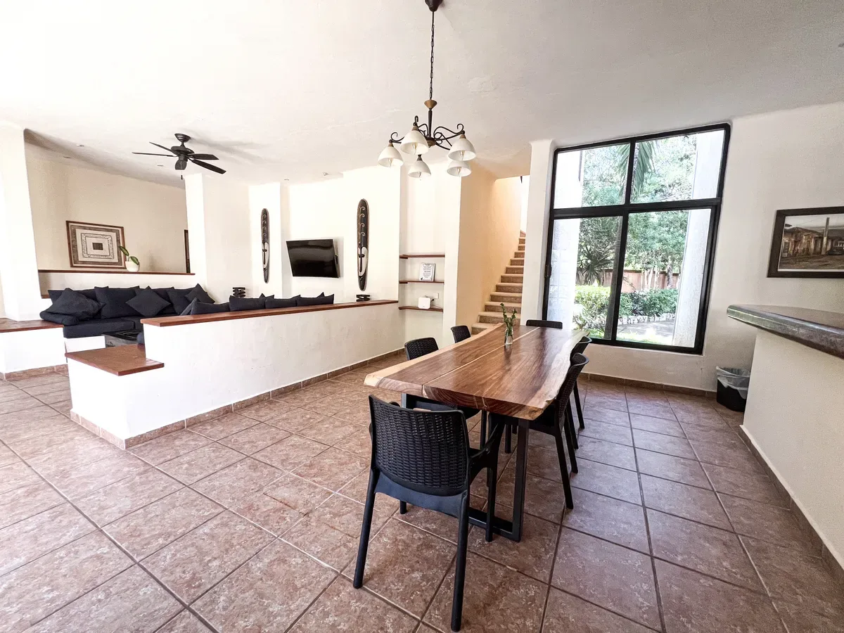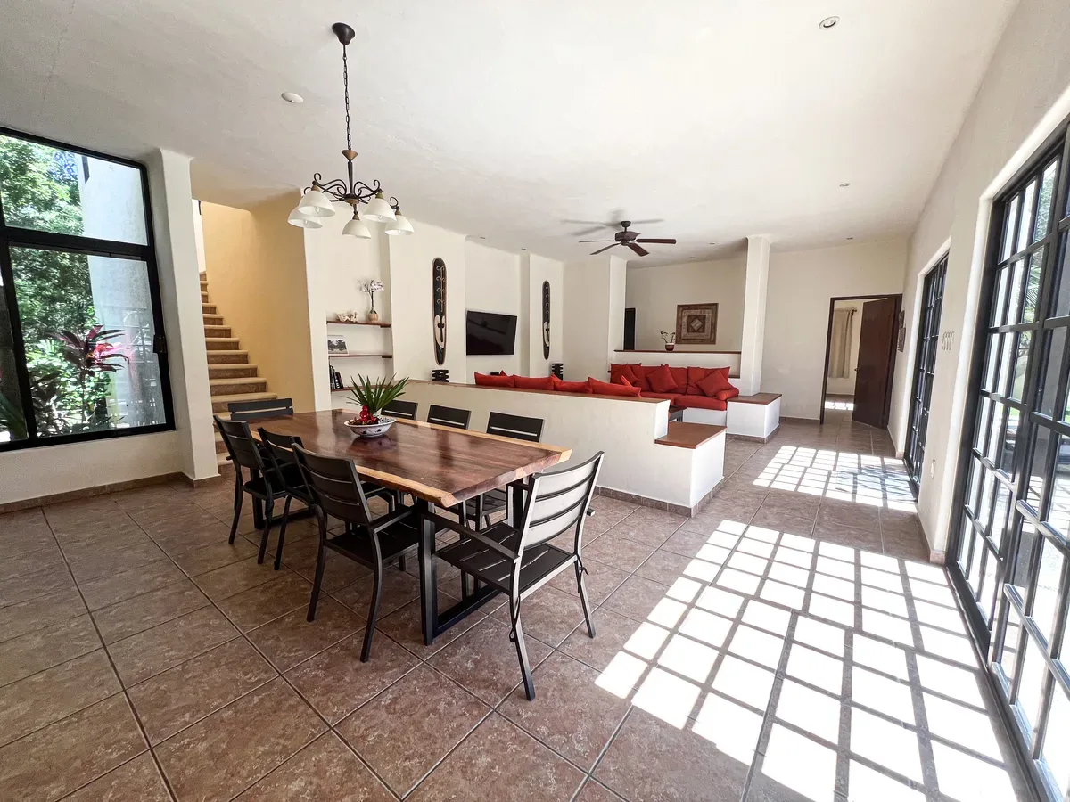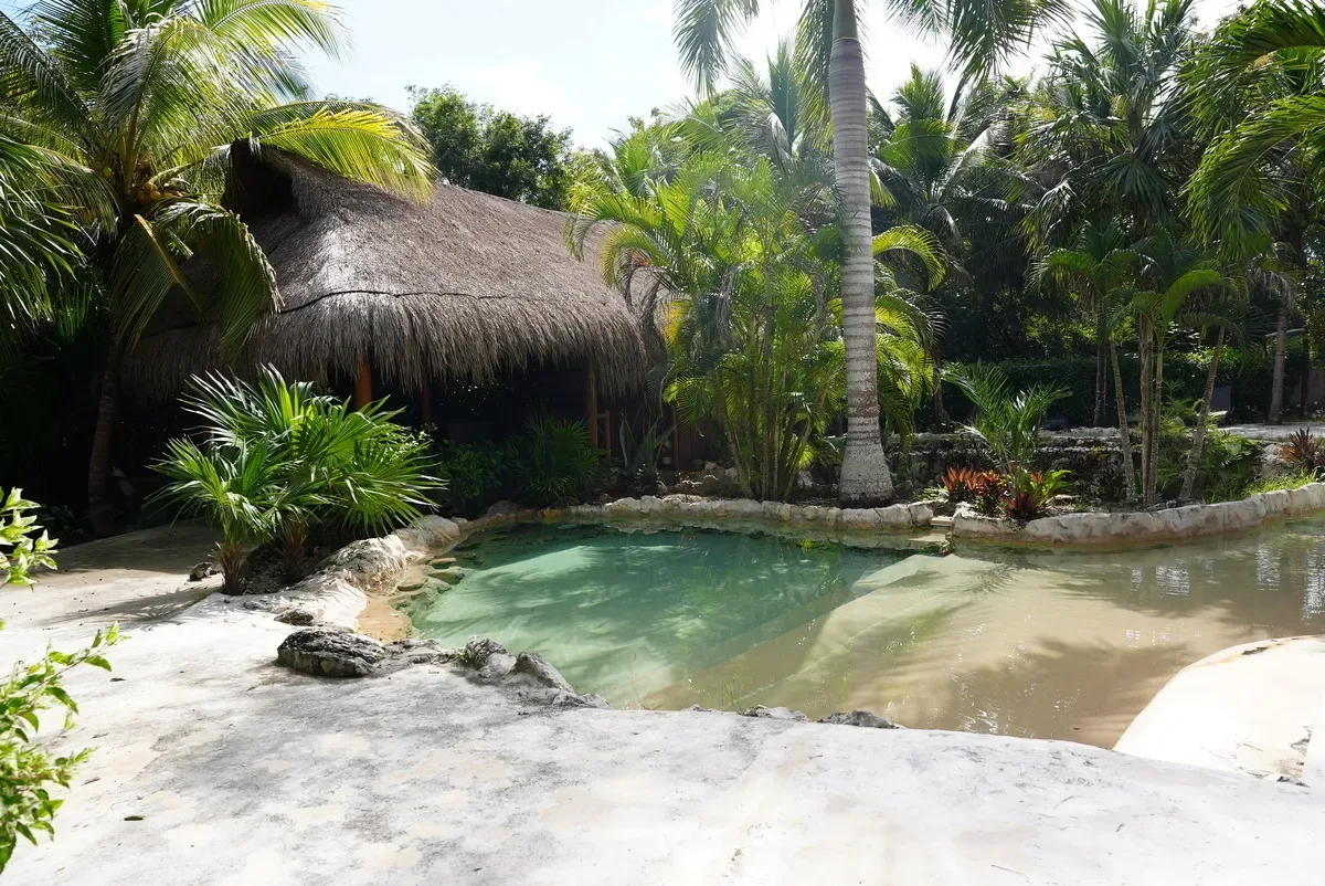 The estate features a large pool area and a palapa. The grounds include a private cenote. The villas present a spacious open floor plan and are fully furnished.
