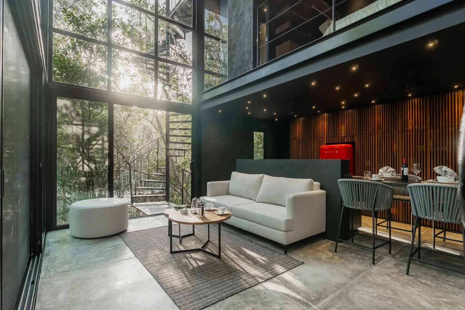The ground floor features a double-height living room, a kitchen with cabinetry, and a bar area adjacent to the dining space.