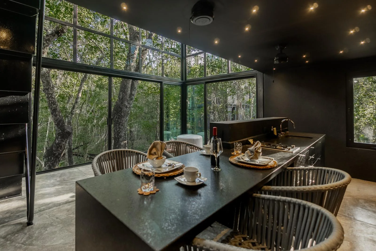 The rooftop level is equipped with a soaking tub, a table for four, and a solarium.