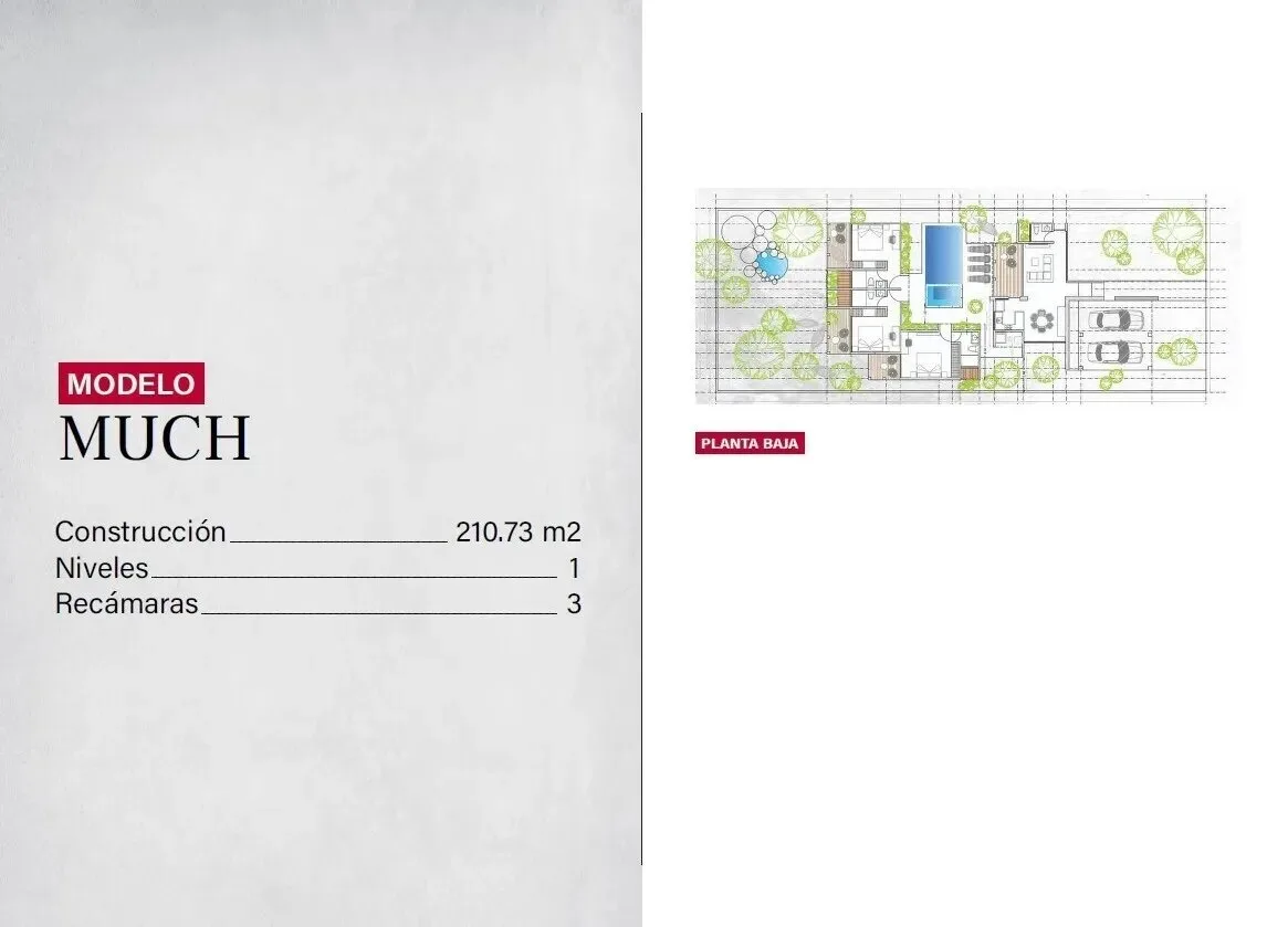 The MUCH house model presents a clear and balanced layout ready for enjoyment. It offers 210. 73 square meters of construction on a 750 square meter lot. The home features an integral kitchen with a breakfast bar, a spacious living room, and a dining room. There are three bedrooms, three bathrooms, and a laundry room. Parking is provided for two vehicles, with options for a private pool, solar panels, and a carport.