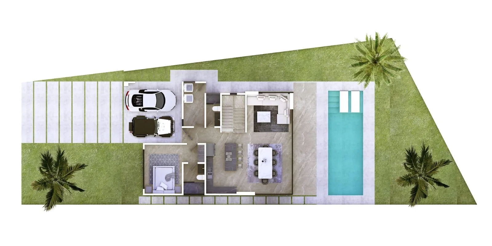 The first floor includes a covered garage. The integrated kitchen has built-in appliances, a dining island, and marble countertops. A spacious living room connects with the dining area, featuring sliding windows. A large covered terrace overlooks the garden and green areas, leading to a sizable swimming pool with a relaxation zone. Bedroom 4 is on this level, complete with a walk-in closet and an en-suite bathroom. There is also a guest bathroom, a service room, and a laundry room accessible from both the interior and exterior.