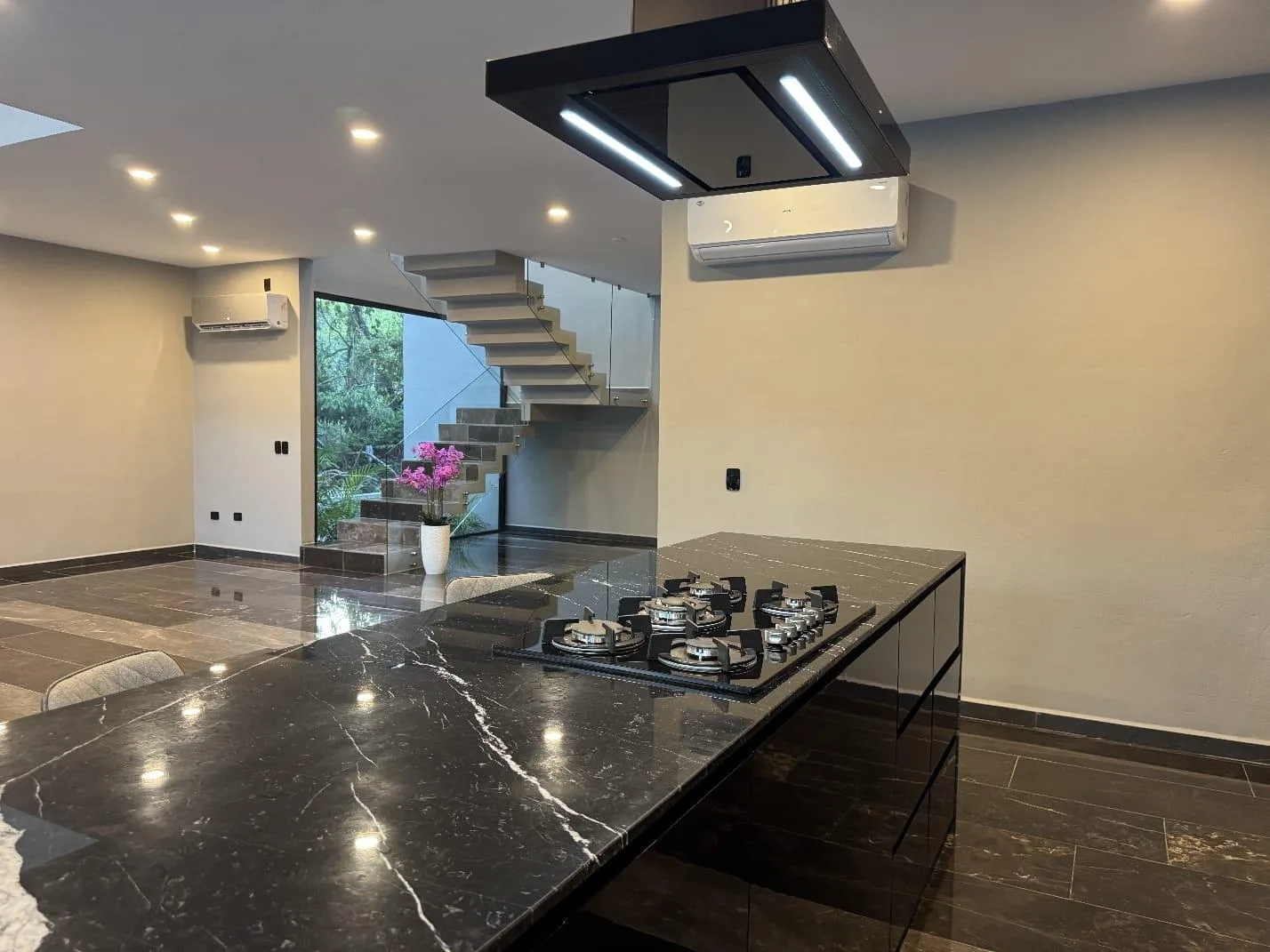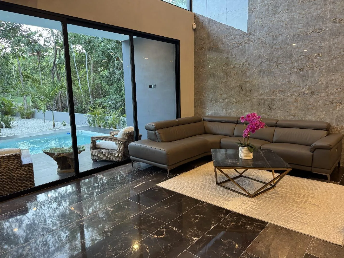 The first floor includes a covered garage for two vehicles. There is an integrated kitchen equipped with built-in appliances, a dining island, and marble countertops. A spacious living room connects to the dining area and features floor-to-ceiling windows that open completely. A large covered terrace overlooks the garden and green areas. The property has a large swimming pool with a relaxation zone. Also on this level is the fourth bedroom with a walk-in closet and ensuite bathroom, a guest bathroom, and a service room and laundry room accessible from both inside and outside the home.