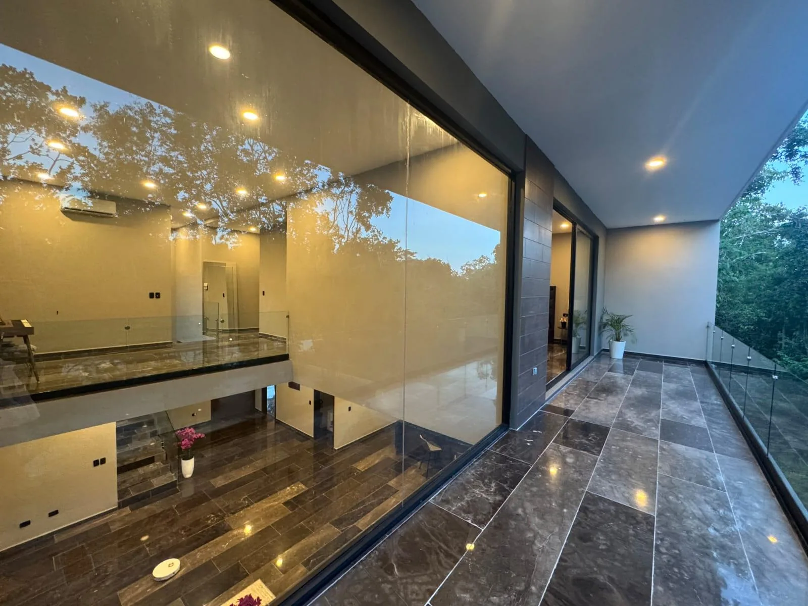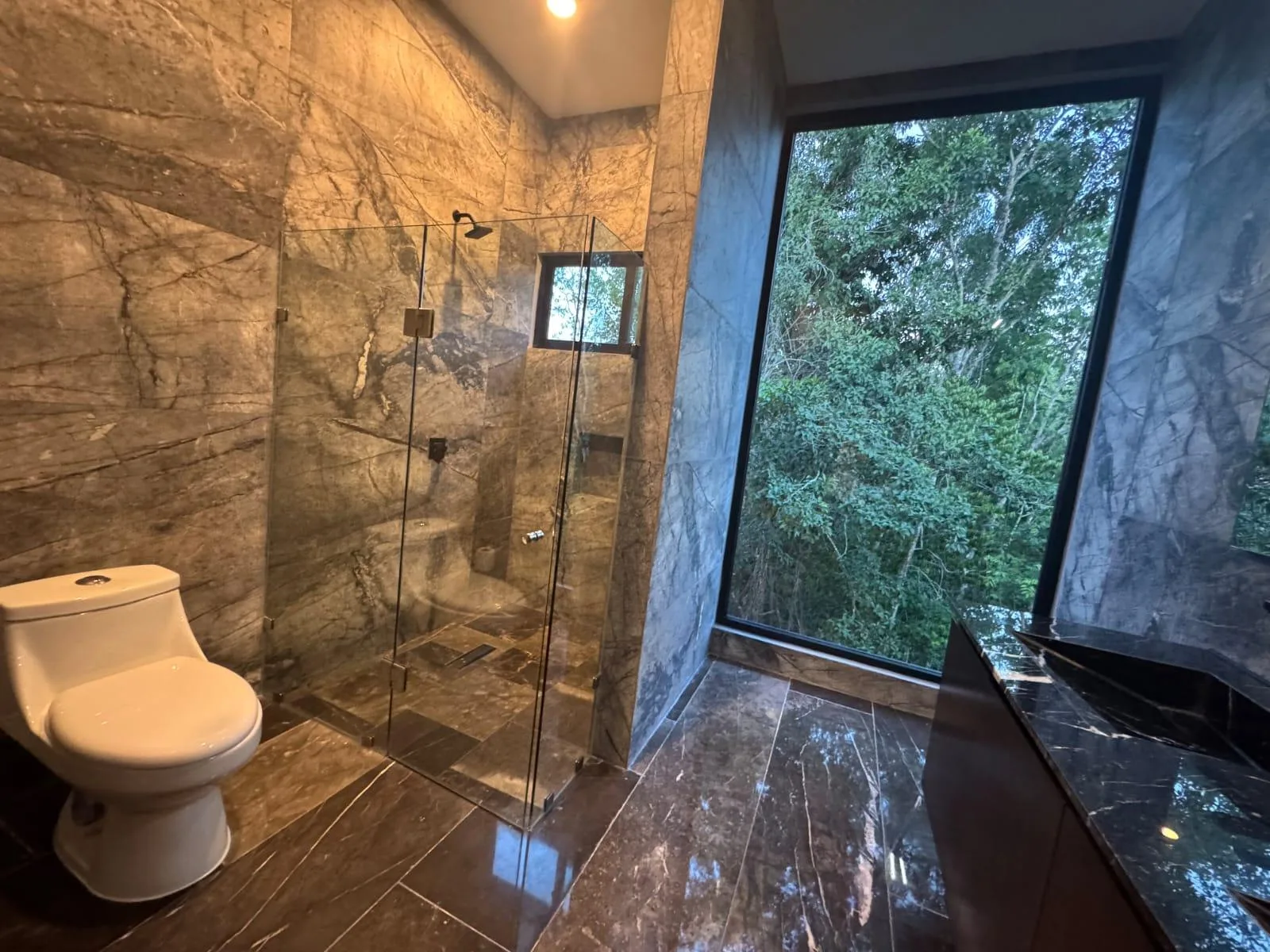 The second floor features an expansive primary bedroom with large windows, a covered terrace, and a generous walk-in closet. Its ensuite bathroom is glass-enclosed and spacious, with a double marble vanity, a shower, and a bathtub. Two additional bedrooms each have large windows, a covered terrace, a walk-in closet or built-in wardrobe, and an ensuite bathroom. This floor also includes a TV room.