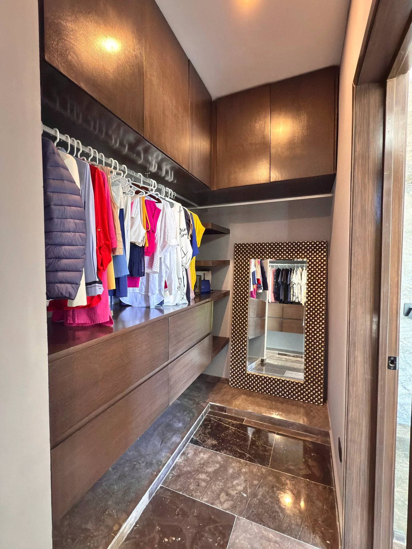 The second floor houses the master suite, which includes sliding glass doors to a covered terrace and a large walk-in closet. The master bathroom features dual marble sinks, a shower, a freestanding bathtub, and its own sliding glass doors to the terrace. Two additional bedrooms on this level each have sliding glass doors to covered terraces, with one including a walk-in closet and the other a built-in closet; both have en-suite bathrooms. This floor also includes a TV lounge.