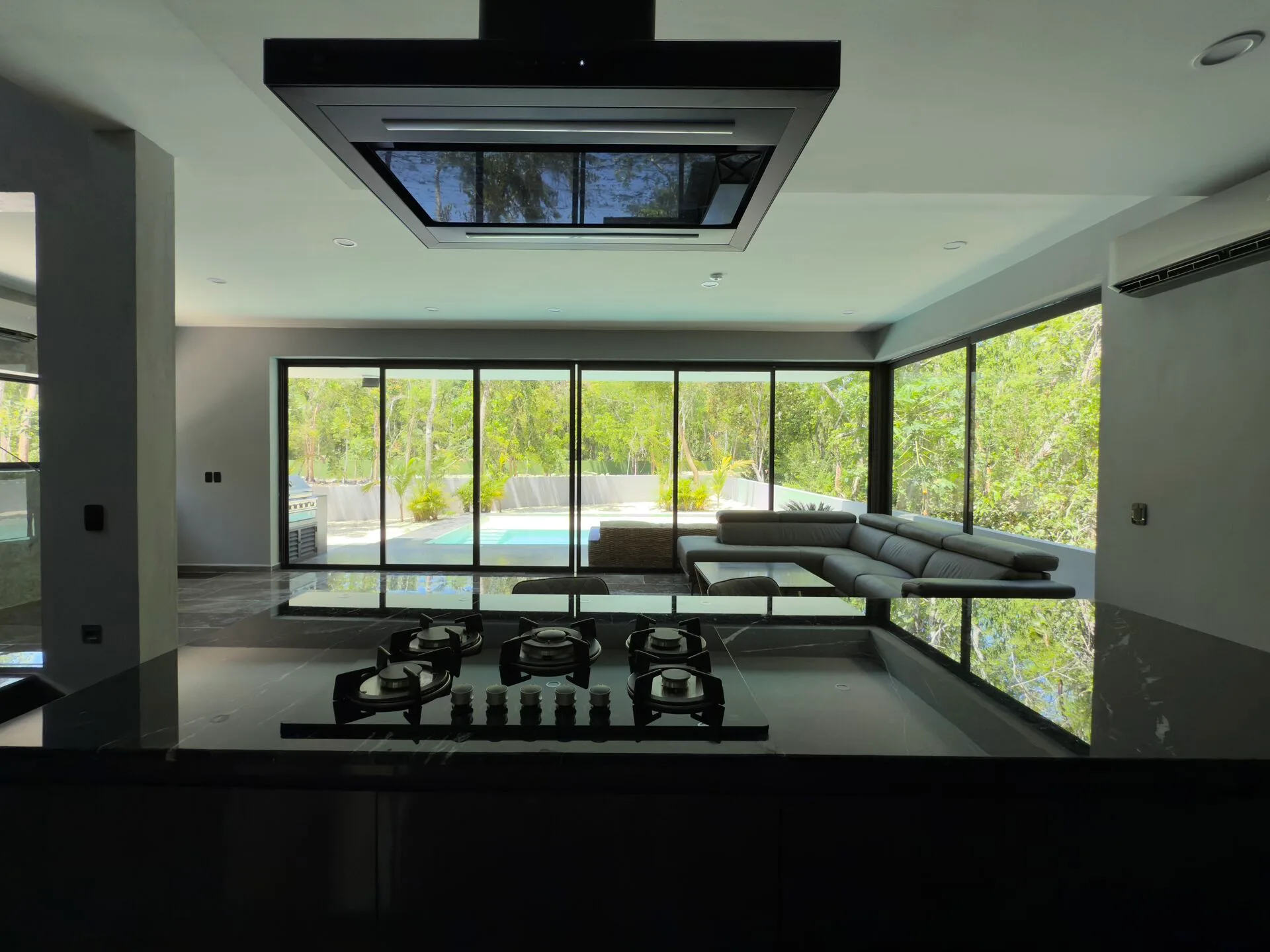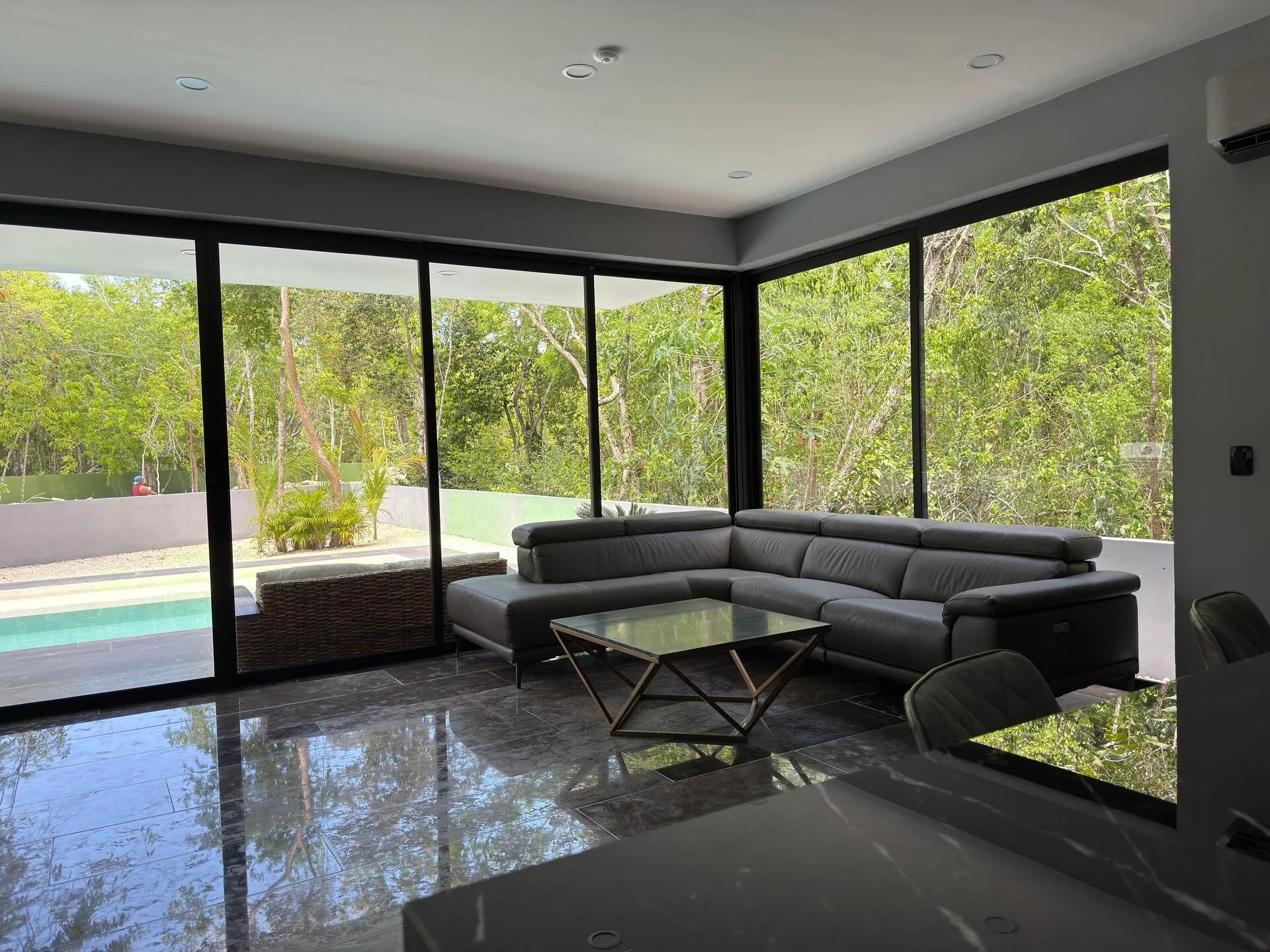 The property includes a covered garage for two vehicles. The first floor presents an open-concept kitchen with built-in appliances, a marble island, and marble countertops. It opens to a spacious living and dining area with floor-to-ceiling sliding glass windows and a covered terrace that overlooks lush gardens. This level also features a large swimming pool with a relaxation area, one bedroom with a walk-in closet and an en-suite bathroom, a full guest bathroom, and a service room and laundry area with both interior and exterior access.