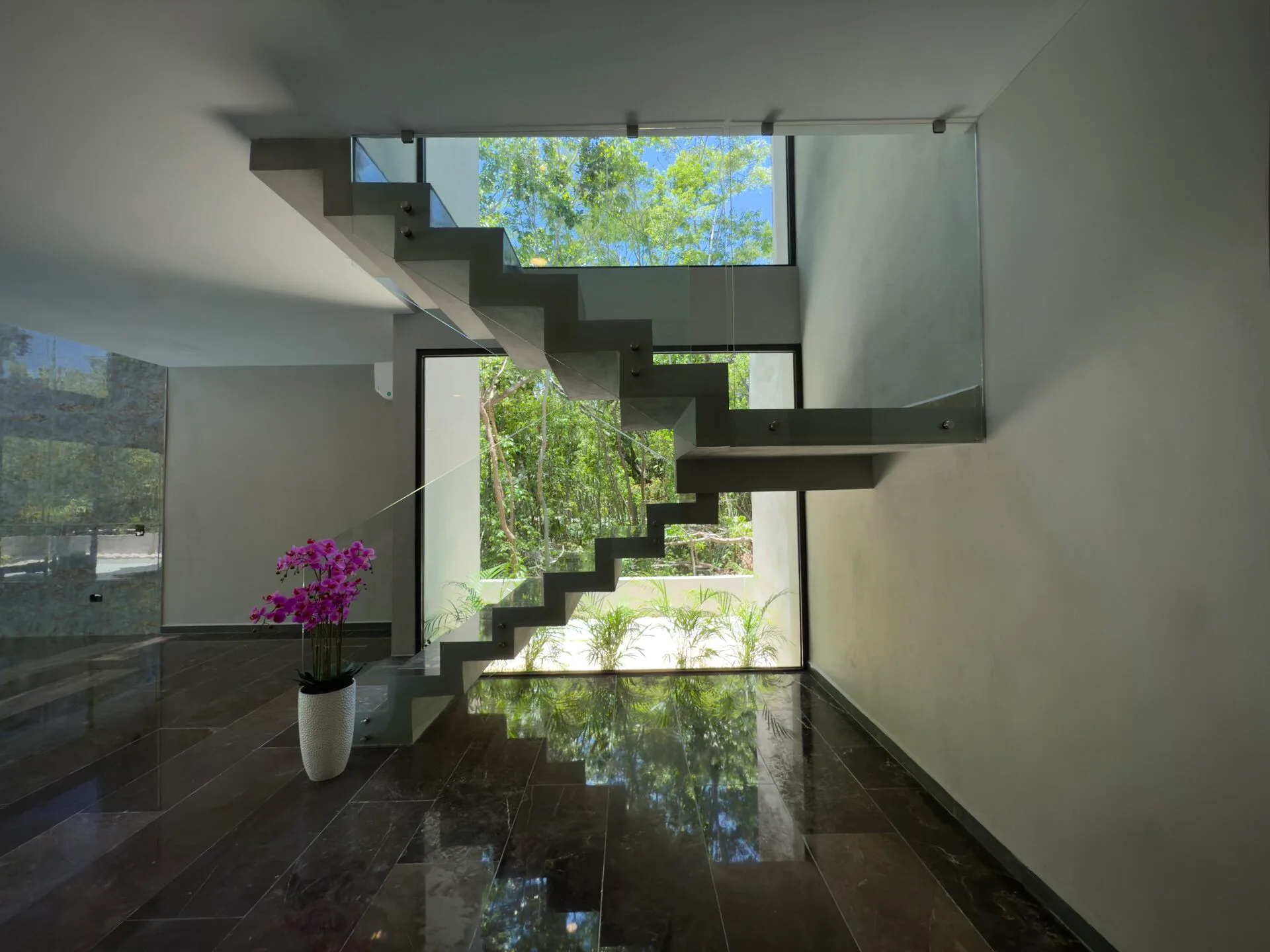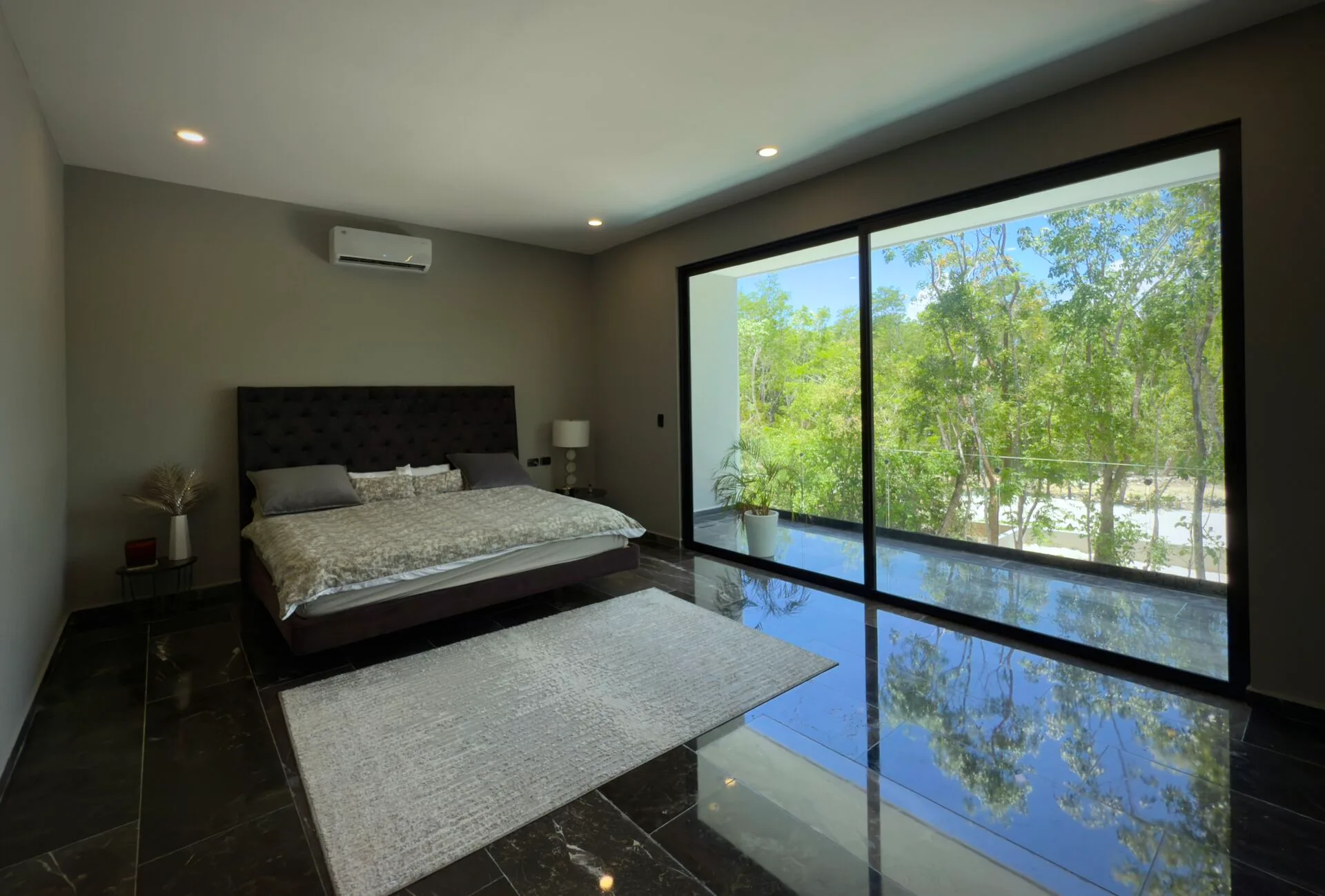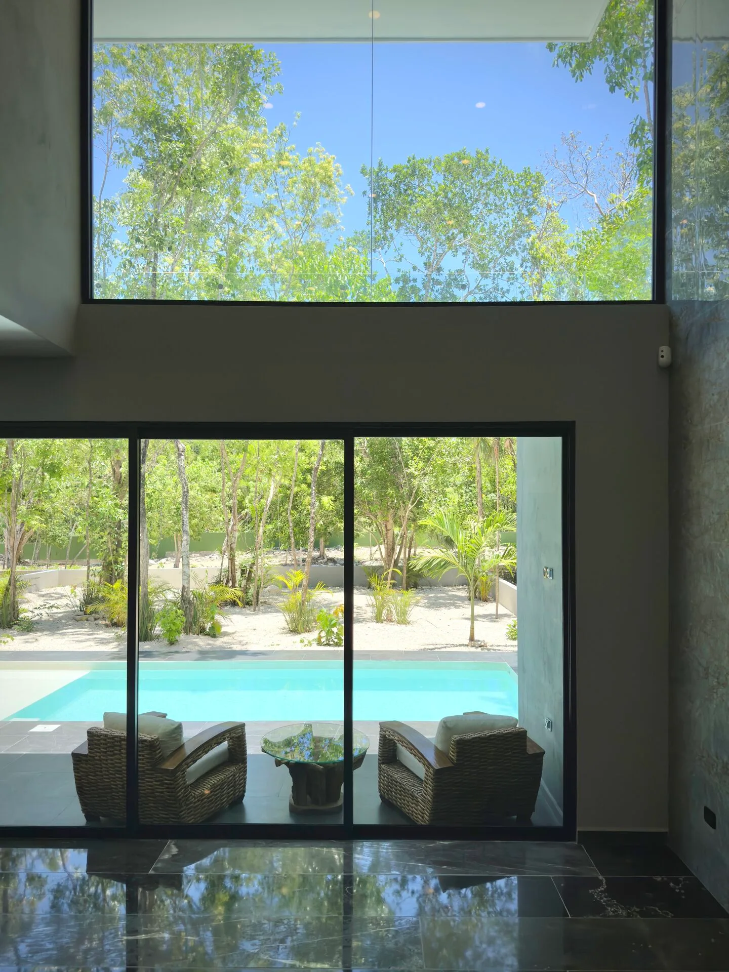 The second floor houses the spacious master bedroom, which features large sliding glass windows, a covered terrace, and a large walk-in closet. The master bathroom is appointed with marble double sinks and a shower. Two additional bedrooms each have full-length sliding glass windows opening to a covered terrace; one includes a large walk-in closet and the other a built-in wardrobe, and both have en-suite bathrooms. This level also contains a TV room with a glass atrium and open floor-to-ceiling space.