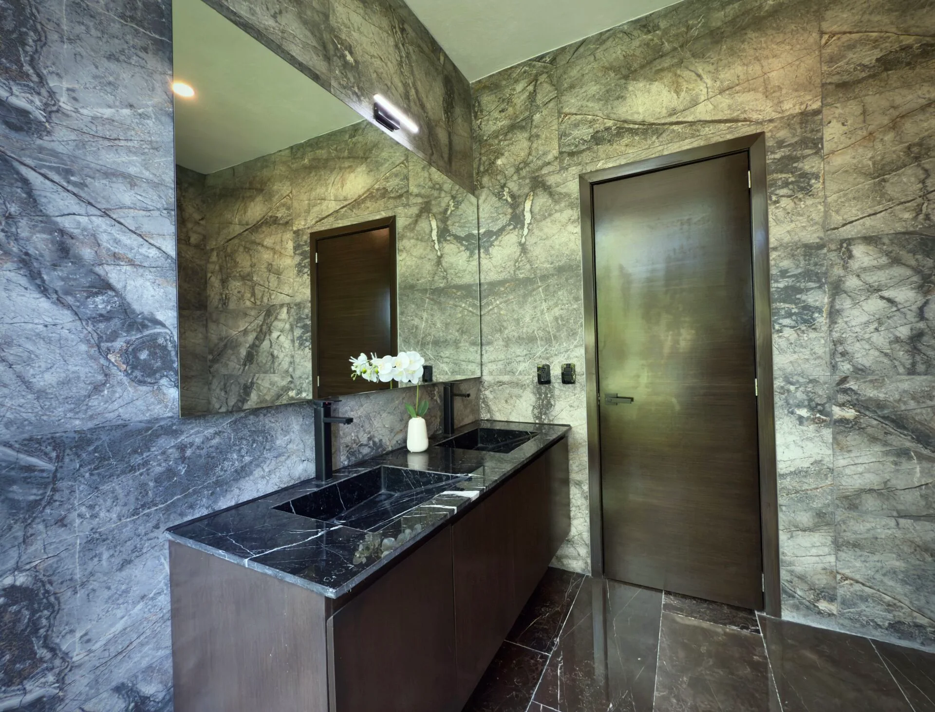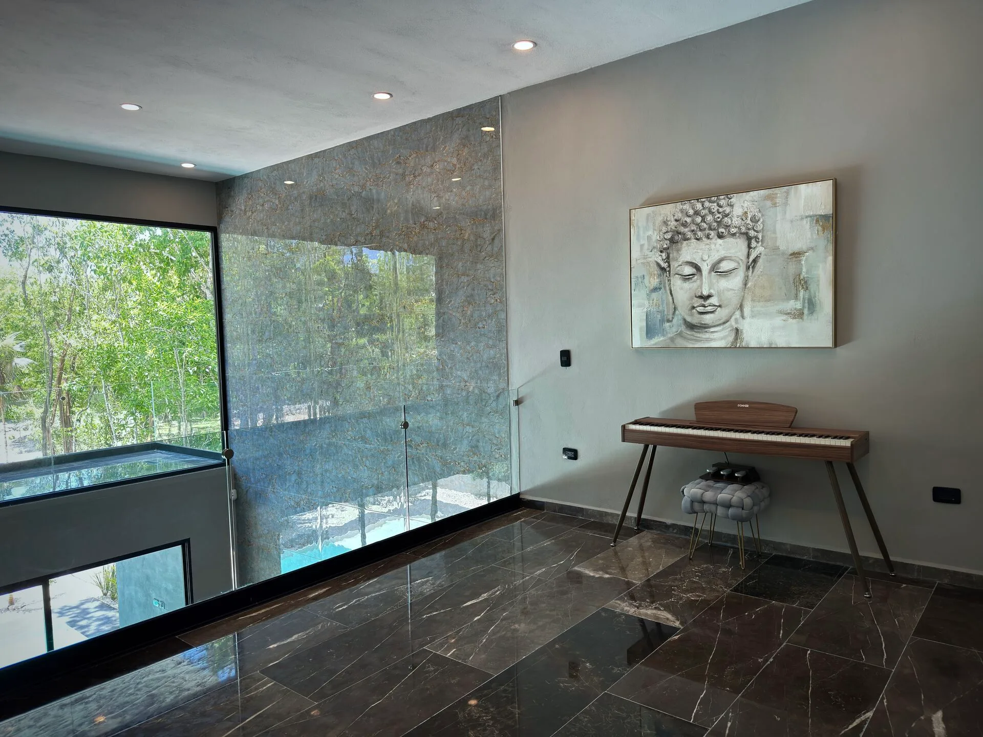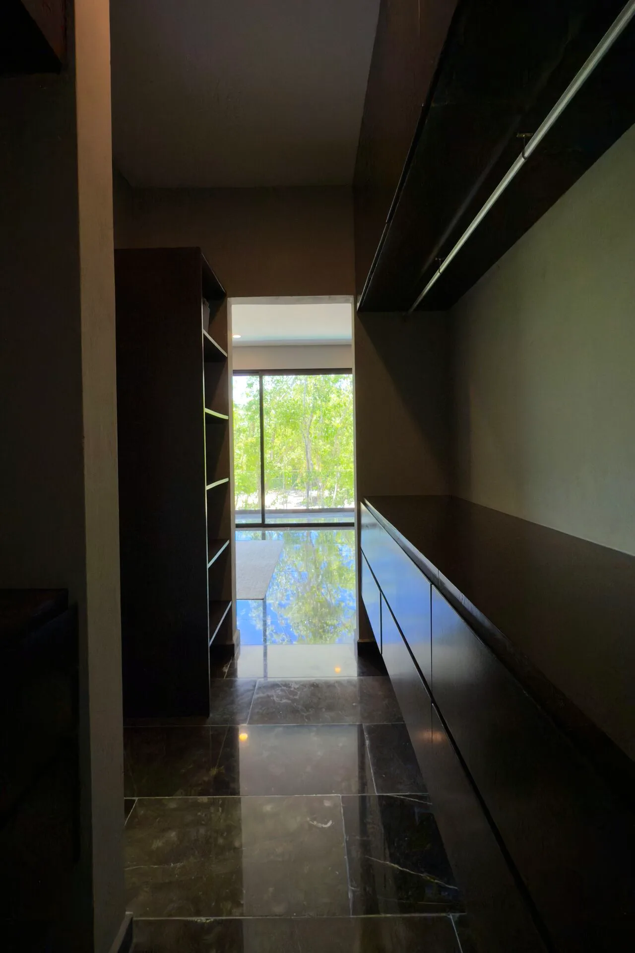 The second floor houses the spacious master bedroom, which features large sliding glass windows, a covered terrace, and a large walk-in closet. The master bathroom is appointed with marble double sinks and a shower. Two additional bedrooms each have full-length sliding glass windows opening to a covered terrace; one includes a large walk-in closet and the other a built-in wardrobe, and both have en-suite bathrooms. This level also contains a TV room with a glass atrium and open floor-to-ceiling space.