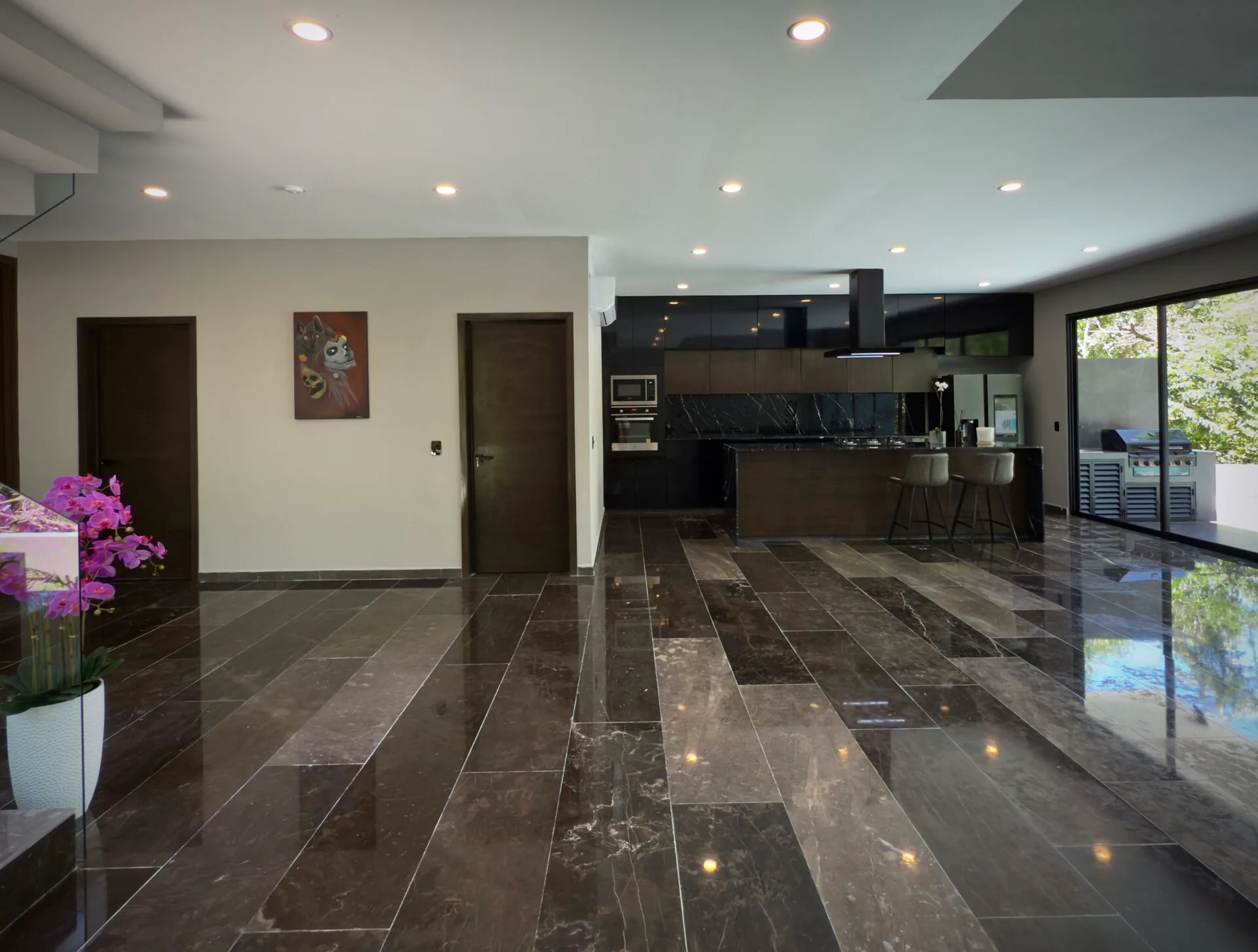 The residence offers a well-considered layout with high-quality finishes throughout. The first floor includes an integrated kitchen with built-in appliances, a dining island, and marble surfaces. A large living room connects to the dining area and features sliding glass windows, a glass atrium, and an open floor-to-ceiling design. This level opens to a large covered terrace with a garden area and a swimming pool with a relaxation zone. Also on this floor is a bedroom or study with an integrated dressing room and bathroom, as well as a separate laundry room.