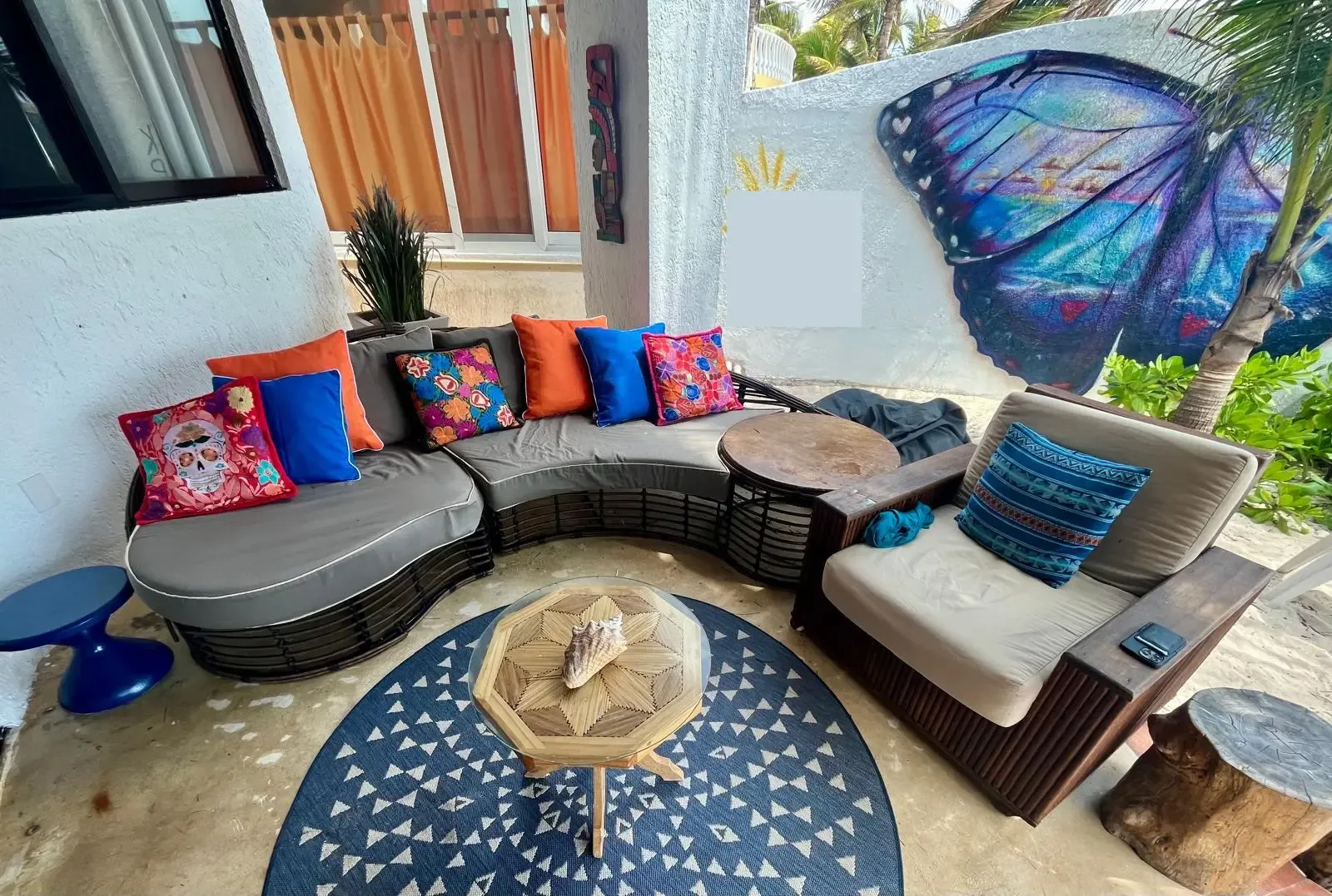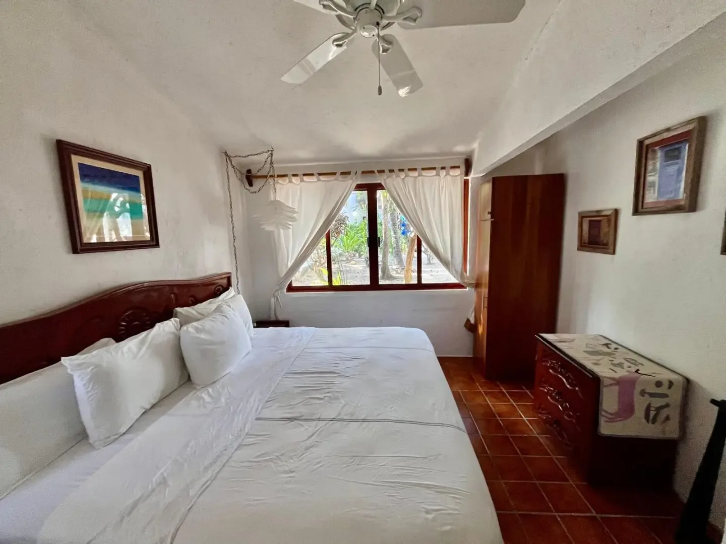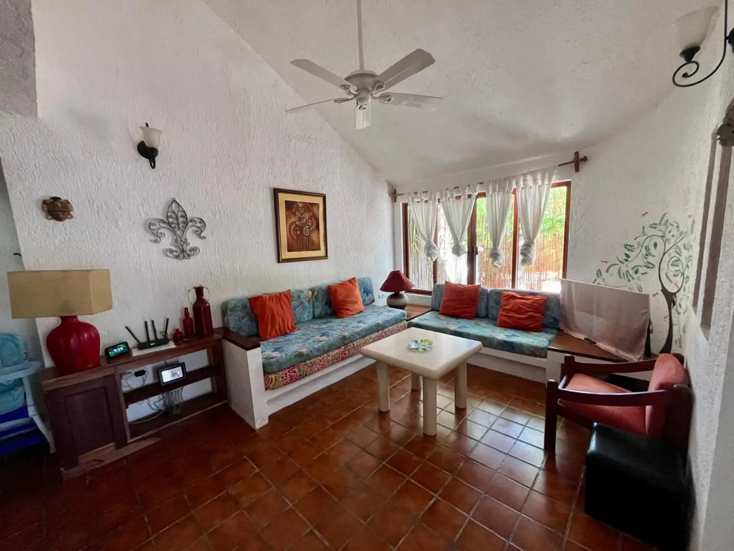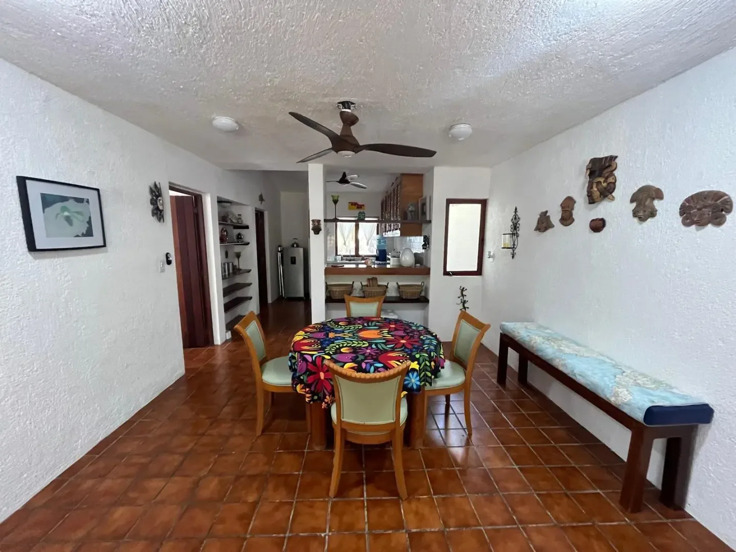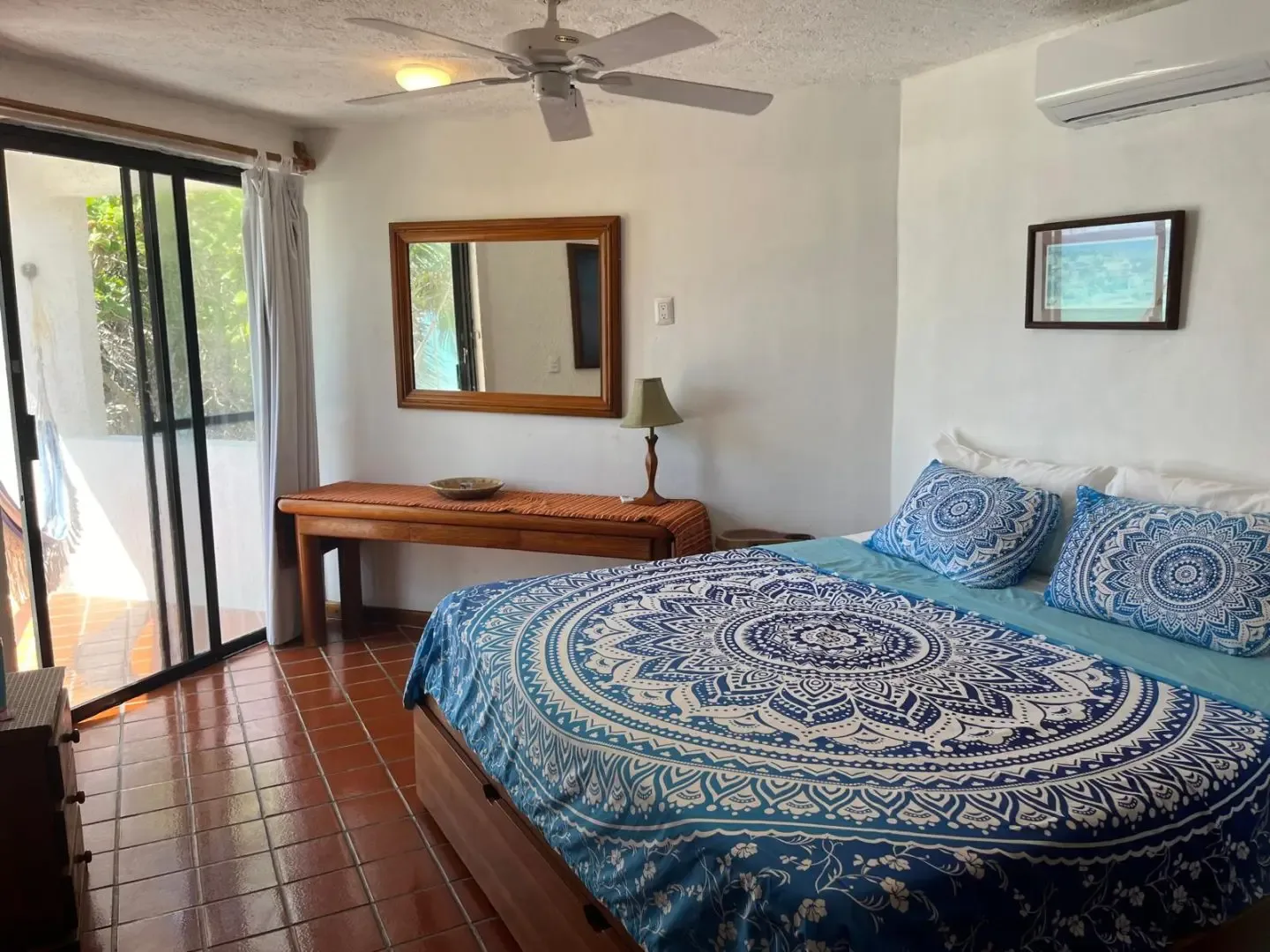 The main house includes three bedrooms, while a separate guest casita adds two more, providing accommodation for up to 11 adults and 2 children. The main house features a master bedroom with a king bed and a trundle, a guest room with a king bed and a trundle, and a third room with a double and a single bed. The guesthouse contains one bedroom with a king-size bed and another with two twin beds that can be converted into a king.