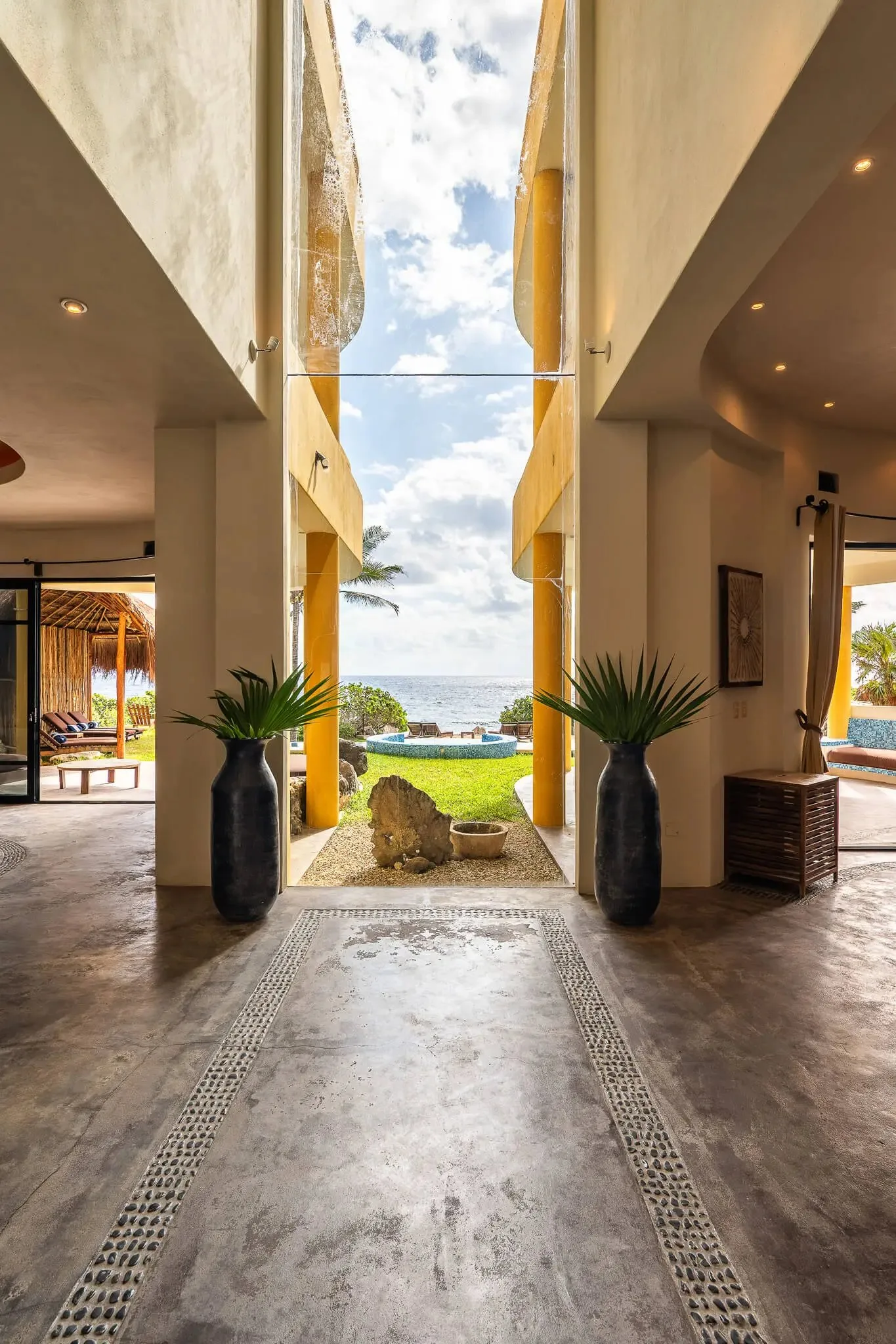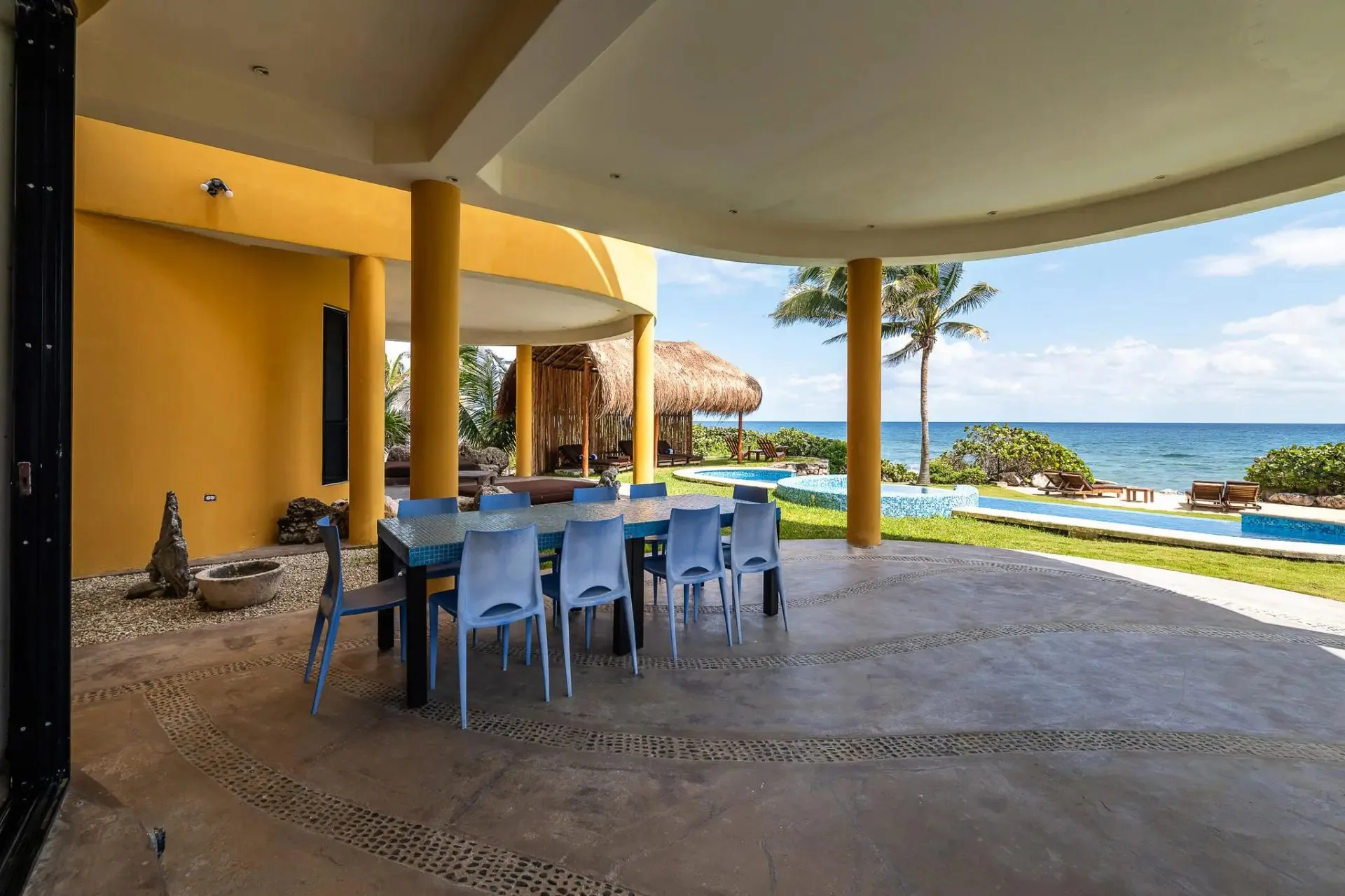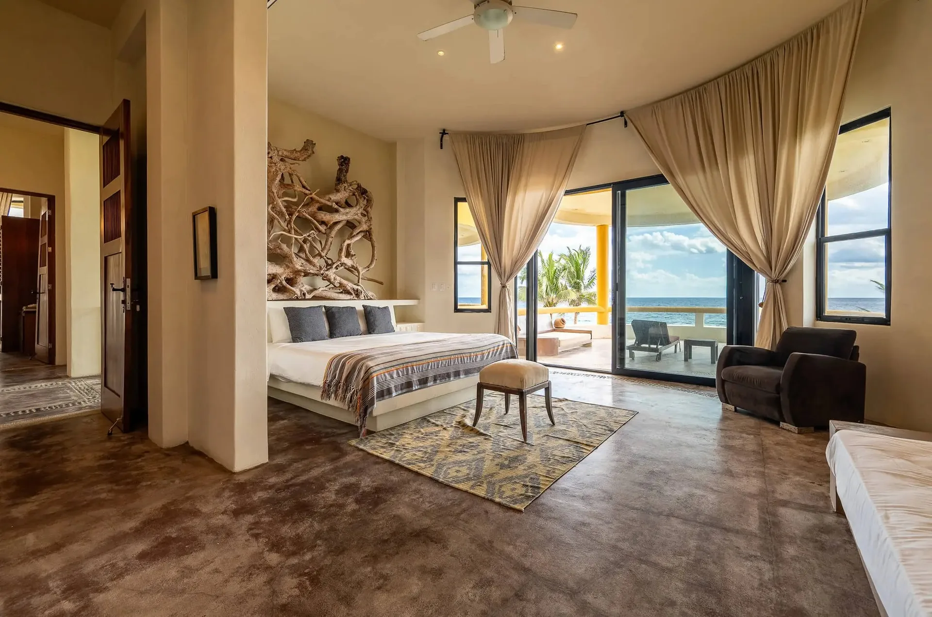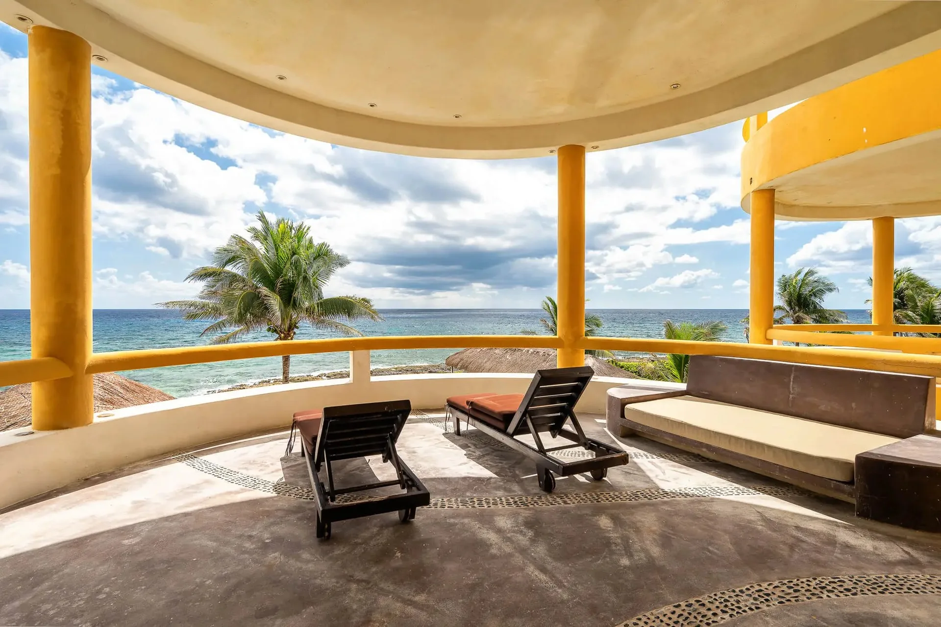 This luxury oceanfront villa near Akumal features 9 spacious ensuite bedrooms, with the flexibility for a 10th, and a private garden. The interiors have a colonial palace-like design with spa-inspired baths, premium finishes, winding staircases, and soft, warm lighting.