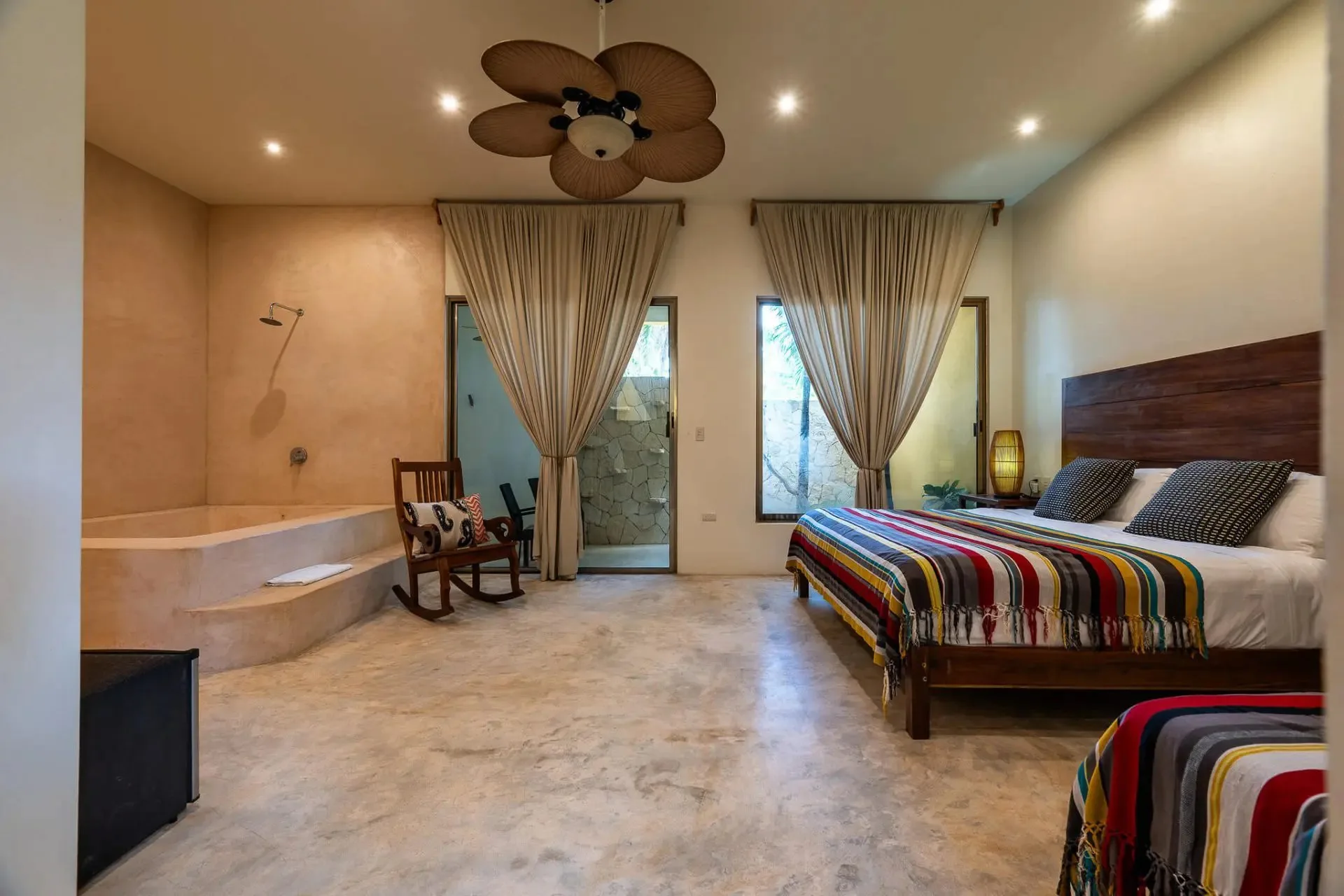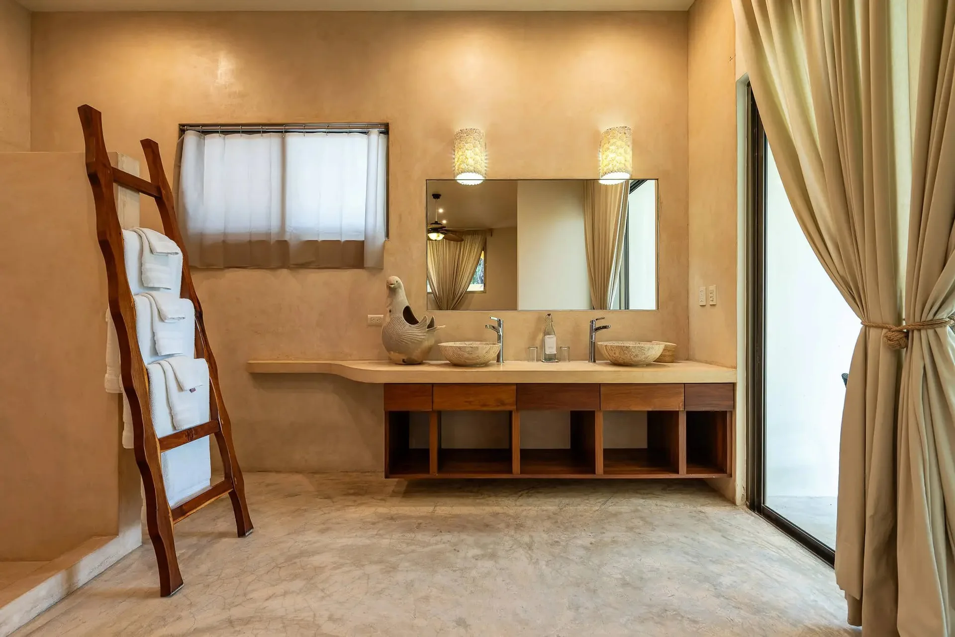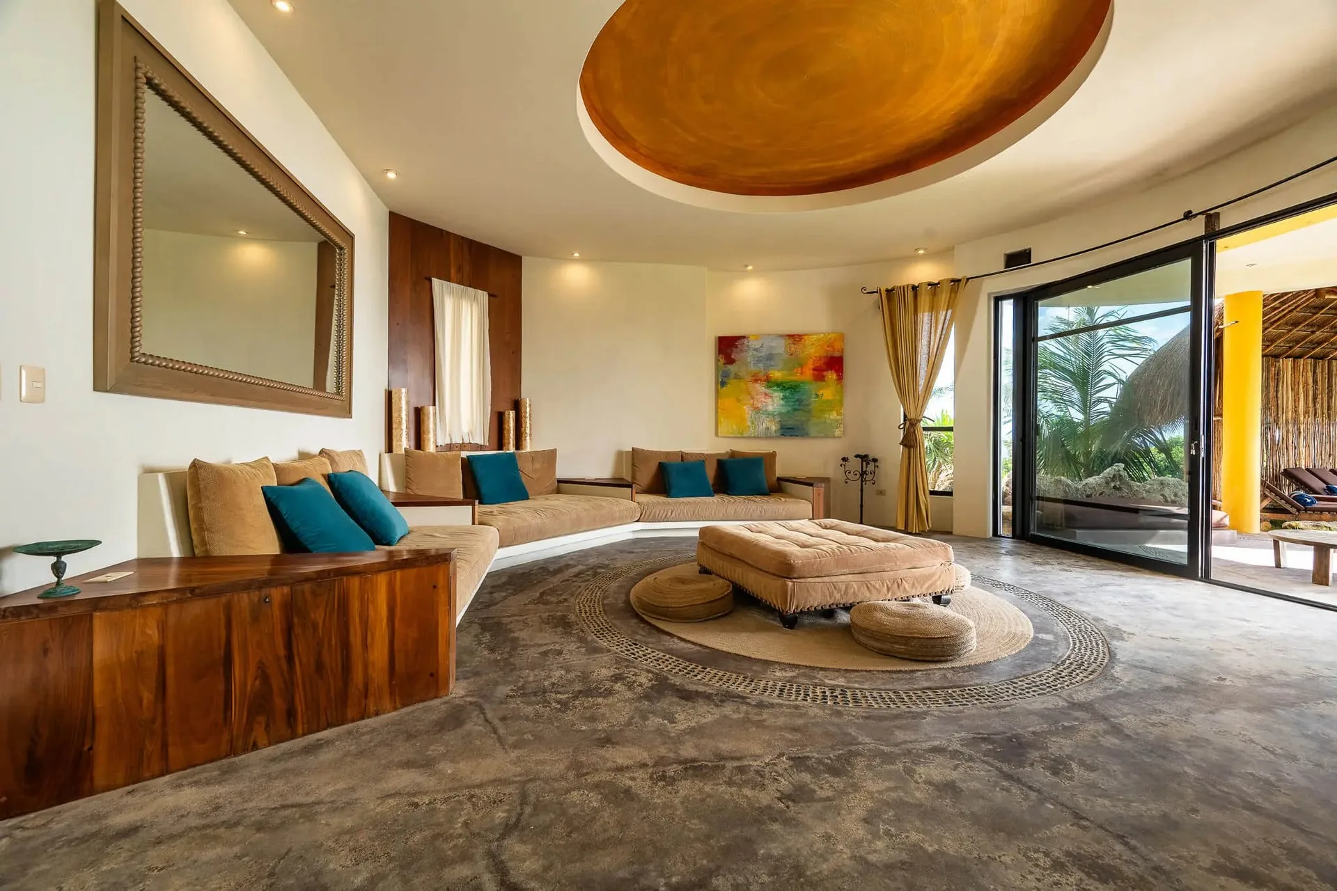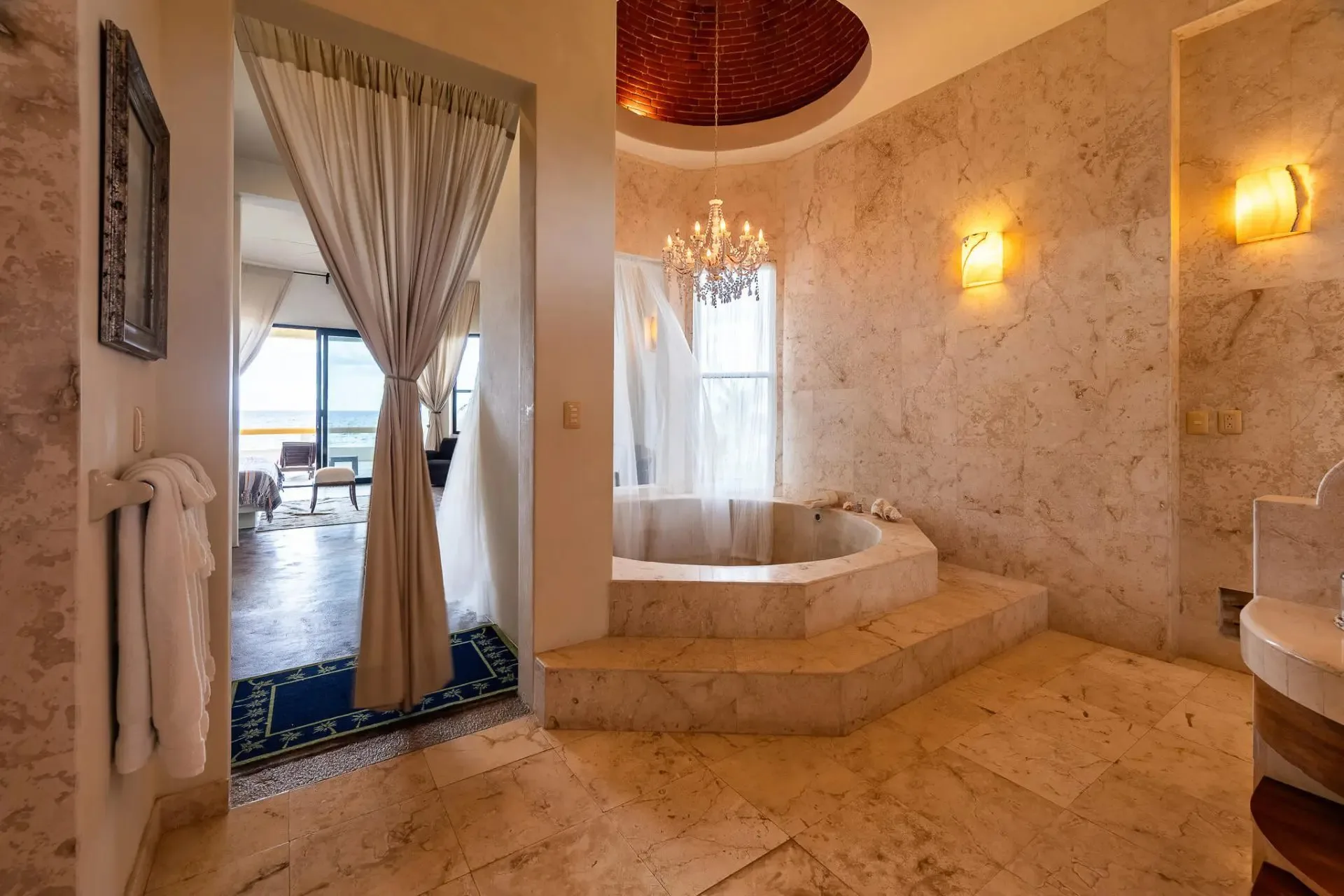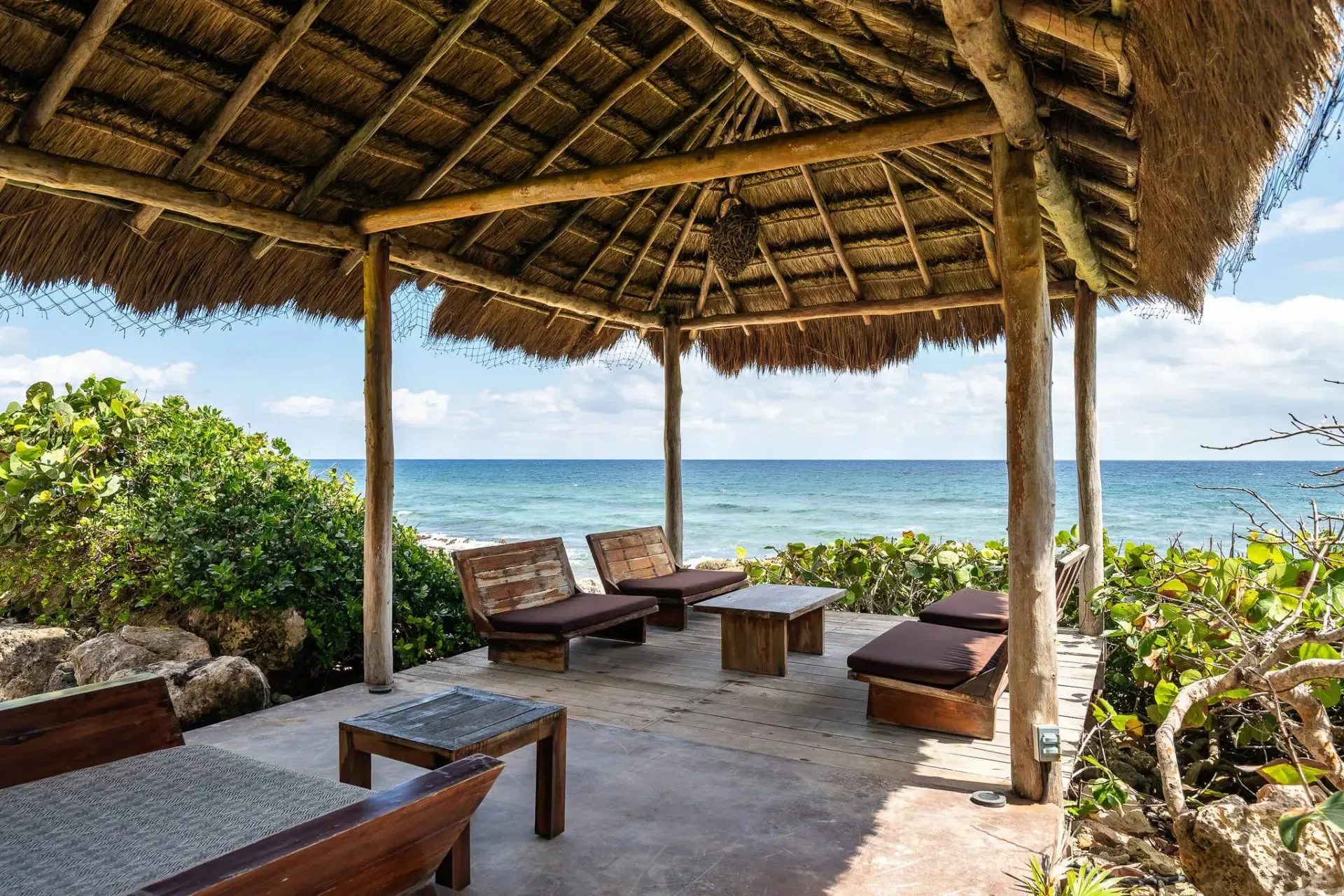 This luxury oceanfront villa near Akumal features 9 spacious ensuite bedrooms, with the flexibility for a 10th, and a private garden. The interiors have a colonial palace-like design with spa-inspired baths, premium finishes, winding staircases, and soft, warm lighting.