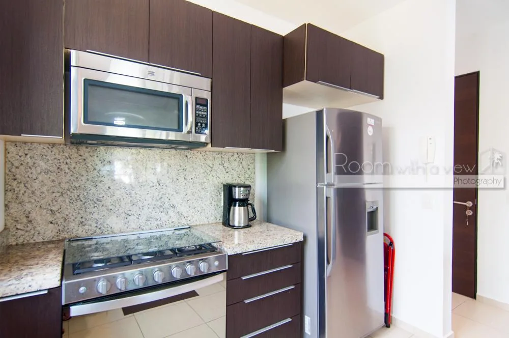 This bright and airy 2-bedroom, 2-bath condo at TAO Residential in Akumal features an open-concept design. The kitchen includes premium appliances, and there is a spacious living and dining area along with a laundry room. Large sliding glass doors in the living room and primary bedroom open onto a covered balcony with jungle views. The condo is fully equipped and move-in ready, offering ample storage, tile floors, and high-end finishes.