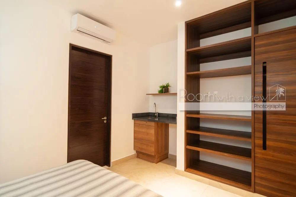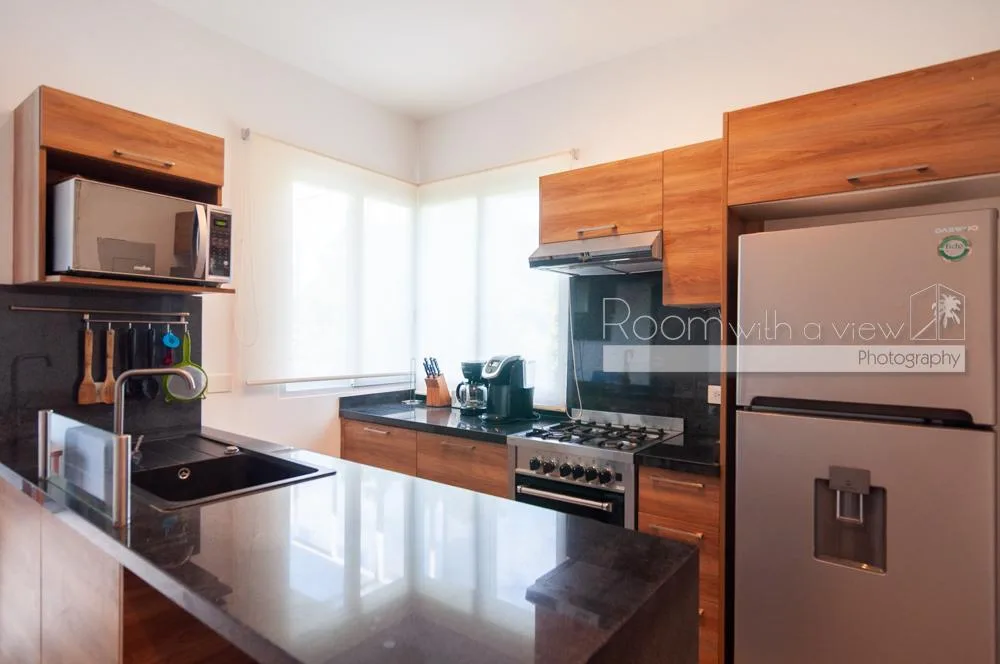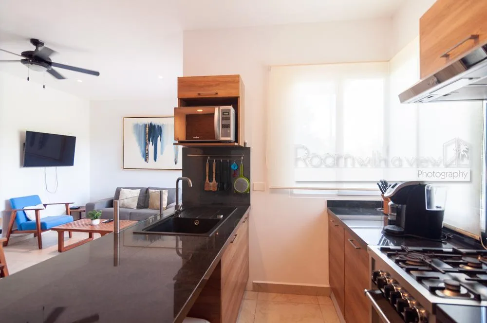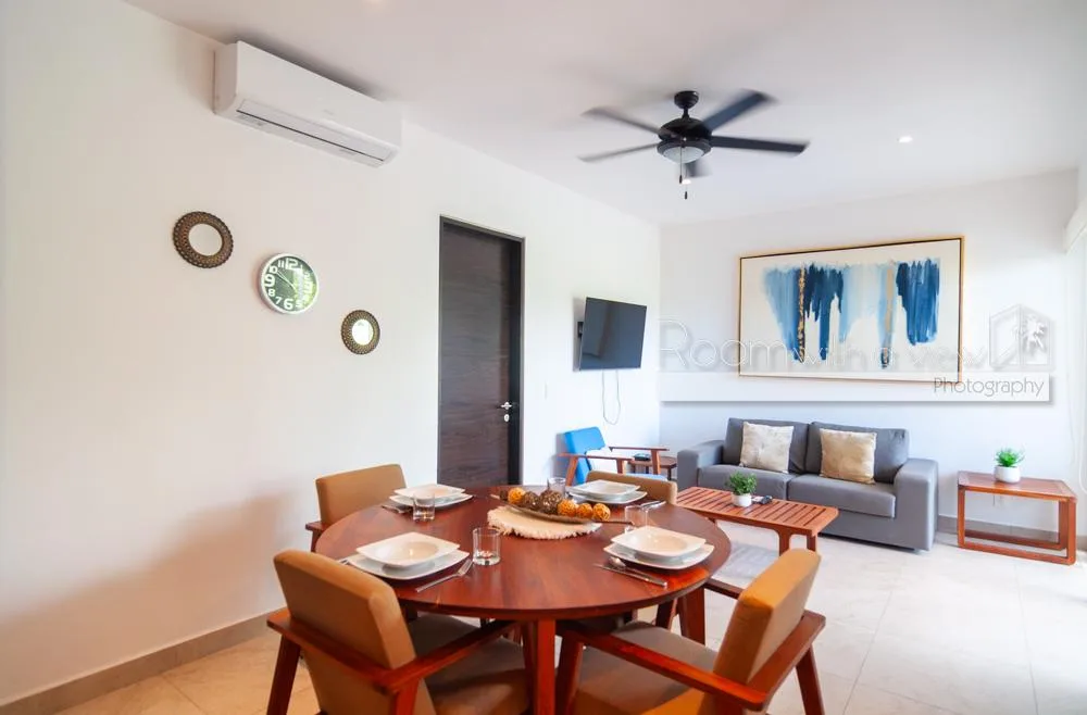 This condo is located within a 550-acre gated community in Akumal, surrounded by jungle. The community features walking paths, landscaped tropical gardens, and natural cenotes. A short stroll leads to a semi-private beach with turquoise water and snorkeling opportunities. Access is controlled with 24-hour security.
