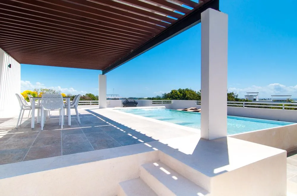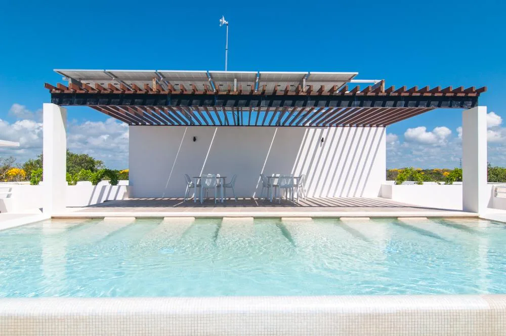 A shared rooftop terrace is available, featuring a pool, sun loungers, an outdoor grill area, and panoramic views.