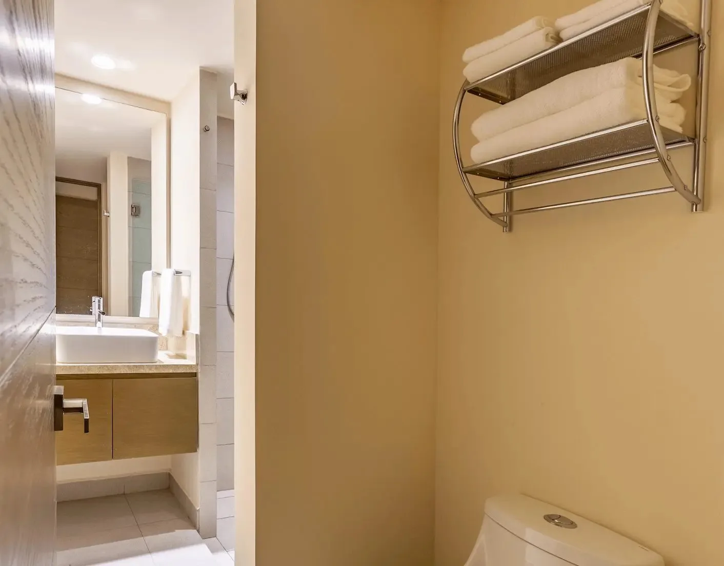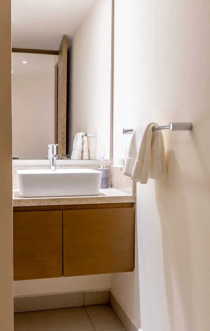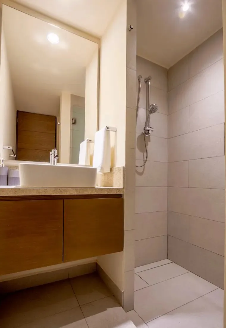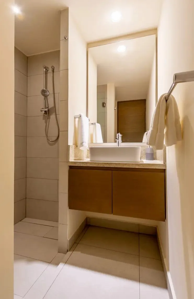 Each building has a rooftop pool with an ocean view. Community amenities include 10 pools, a beach club, access to the beach, BBQ areas, a gym, and a yoga area.