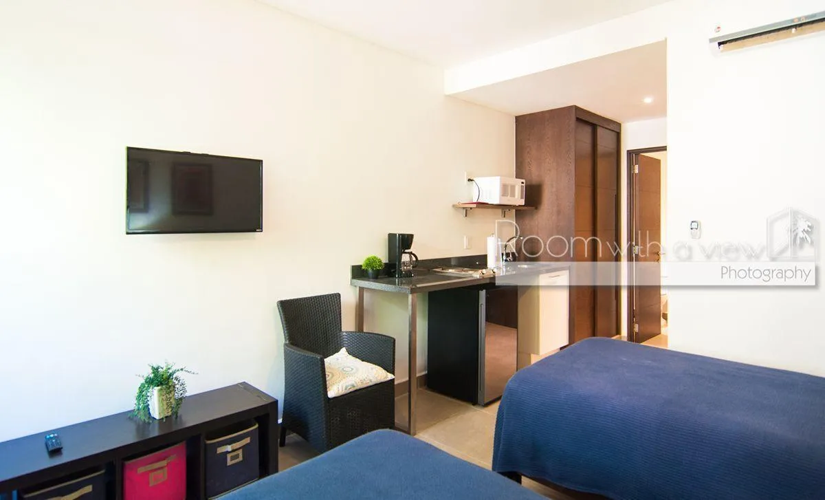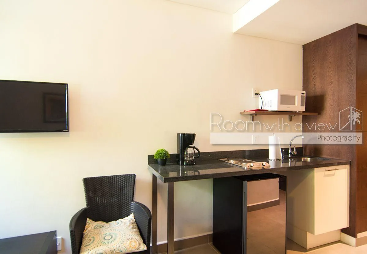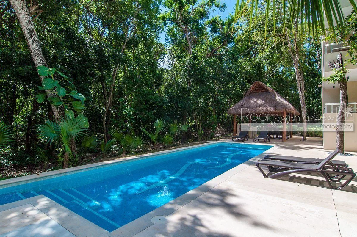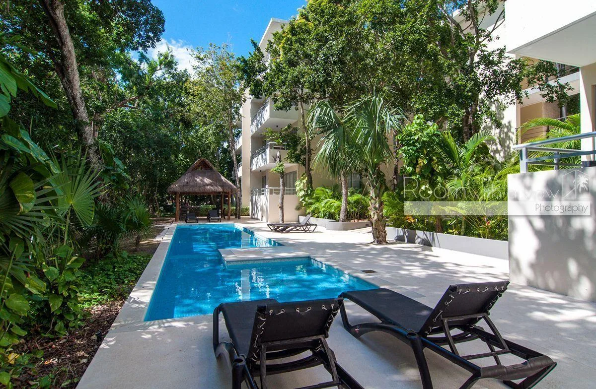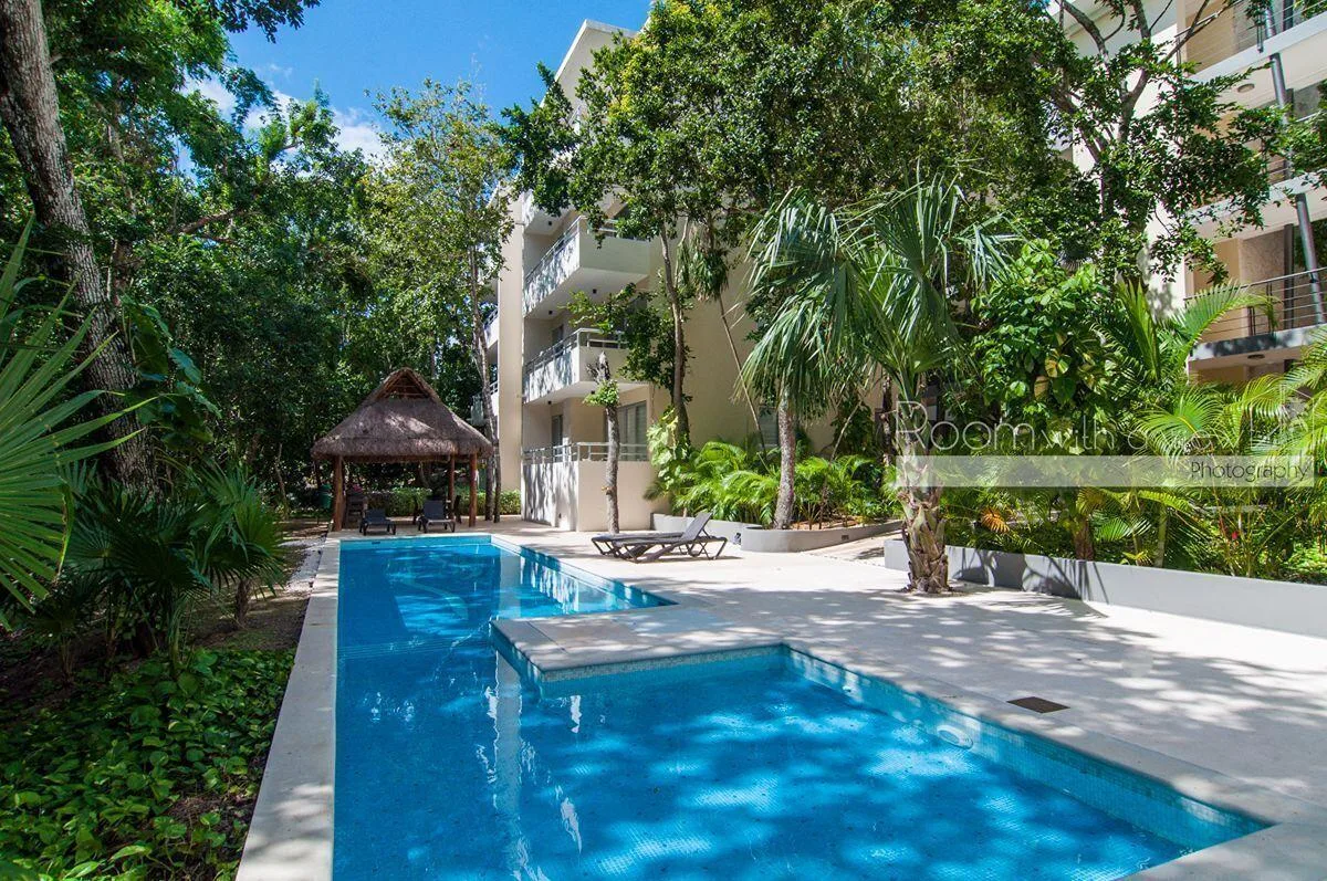 The building provides a community pool and a palapa equipped with a dining set and a grill.