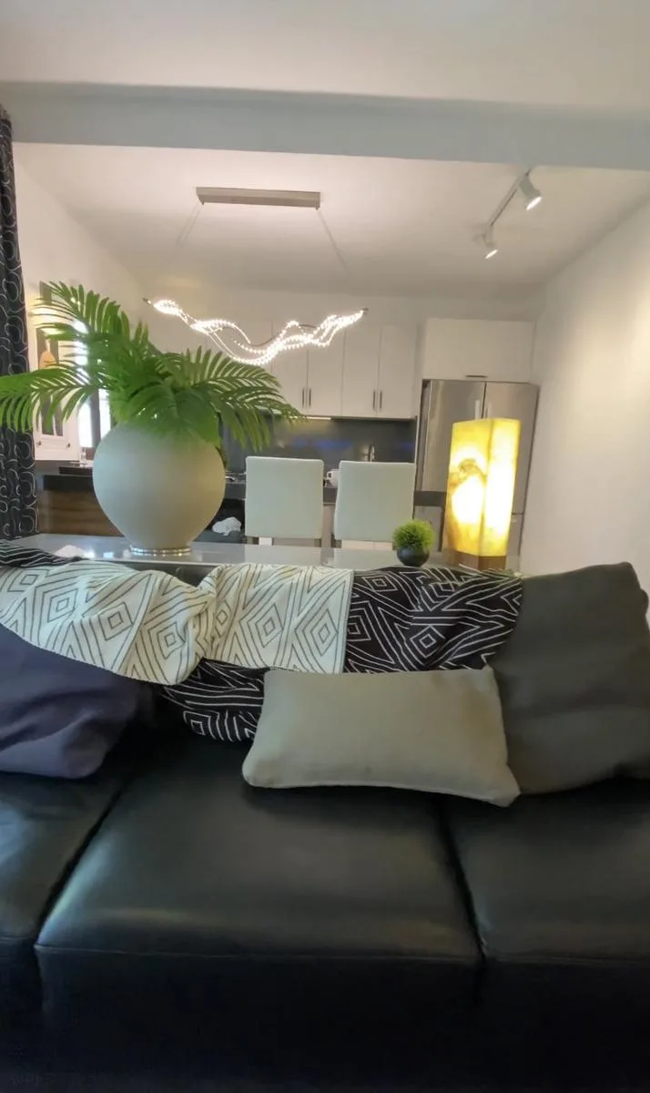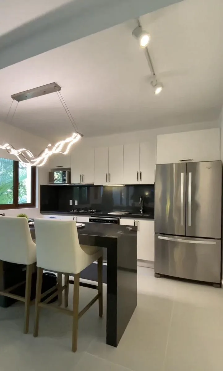 The unit is equipped with high-end furniture imported from Italy and the USA, including a leather sofa and a California King latex bed. Premium lighting and finishes are featured throughout. The property includes a full kitchen with appliances, a washer and dryer, and a 65-inch Sony television. An optional privacy curtain can be installed between the living area and the bedroom.
