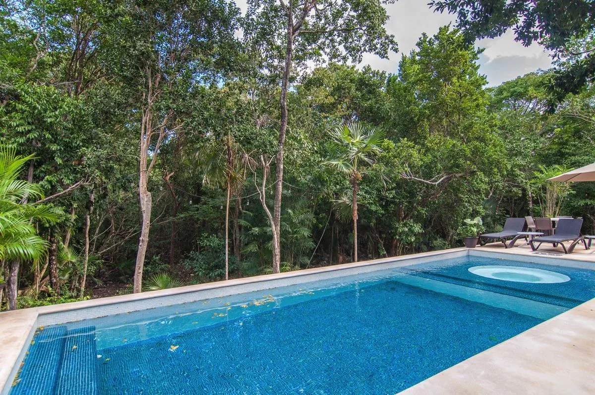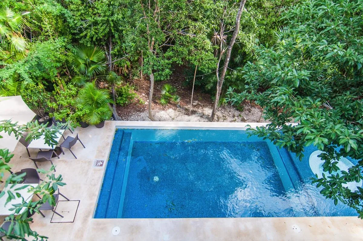 The condominium building provides a beautiful communal pool area with a sundeck and a shaded palapa on the ground level. It also features a large rooftop terrace with a jacuzzi, a sunbathing area, and panoramic jungle views.