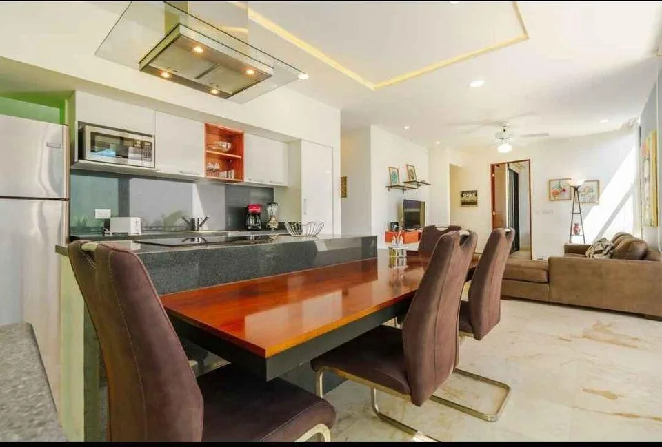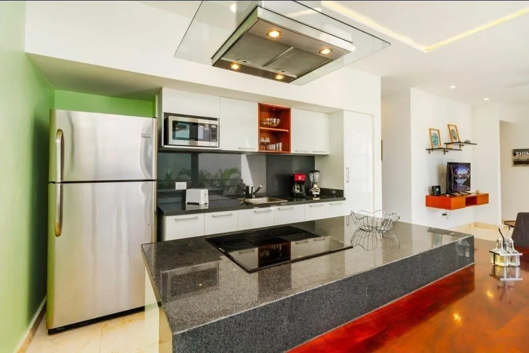 The residence is a Mexican-style apartment filled with natural light. It features one bedroom with a king-size bed, a closet, and a smart TV. There is one bathroom, a spacious kitchen with an island, a living and dining area, and a large terrace.