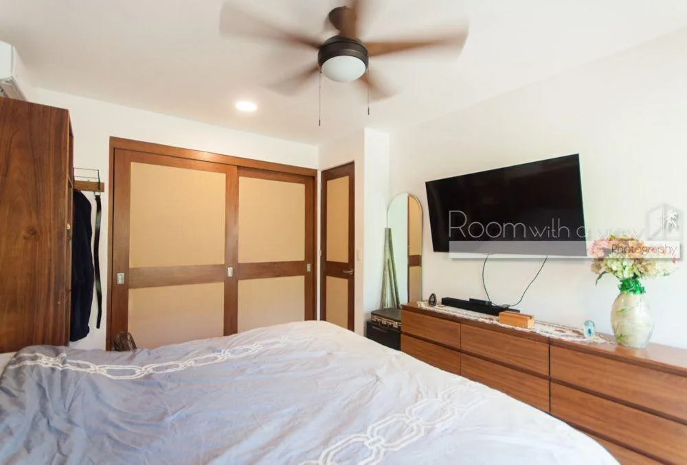 The bedrooms feature closets and floor-to-ceiling windows that allow abundant natural light. The condo has tile floors and high-quality, durable finishes. It is offered fully furnished and includes ceiling fans, air conditioning, and storm windows. A vehicle shown in the photographs is included in the sale.