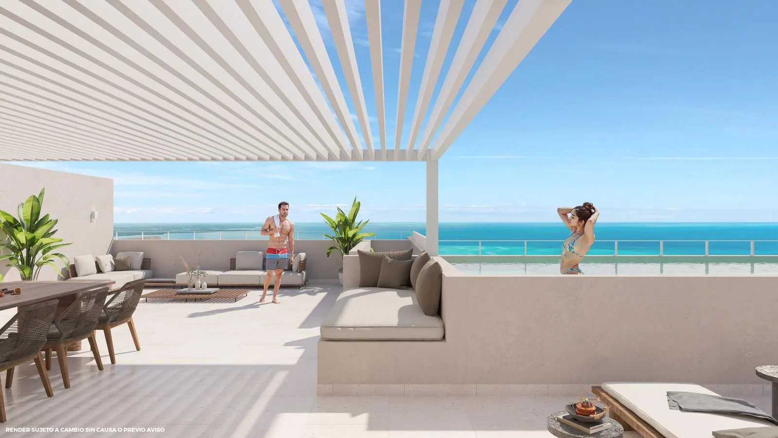The property features a comprehensive suite of amenities. These include seven common rooftop areas with a pool, two sunbathing zones, private terraces, lounge areas, a yoga deck, and a barbecue zone. Additional building features are on-site parking, 24/7 security, elevators, a gym, and a wellness center. There is also access to a beach club and the Playa Jungle Fish area.