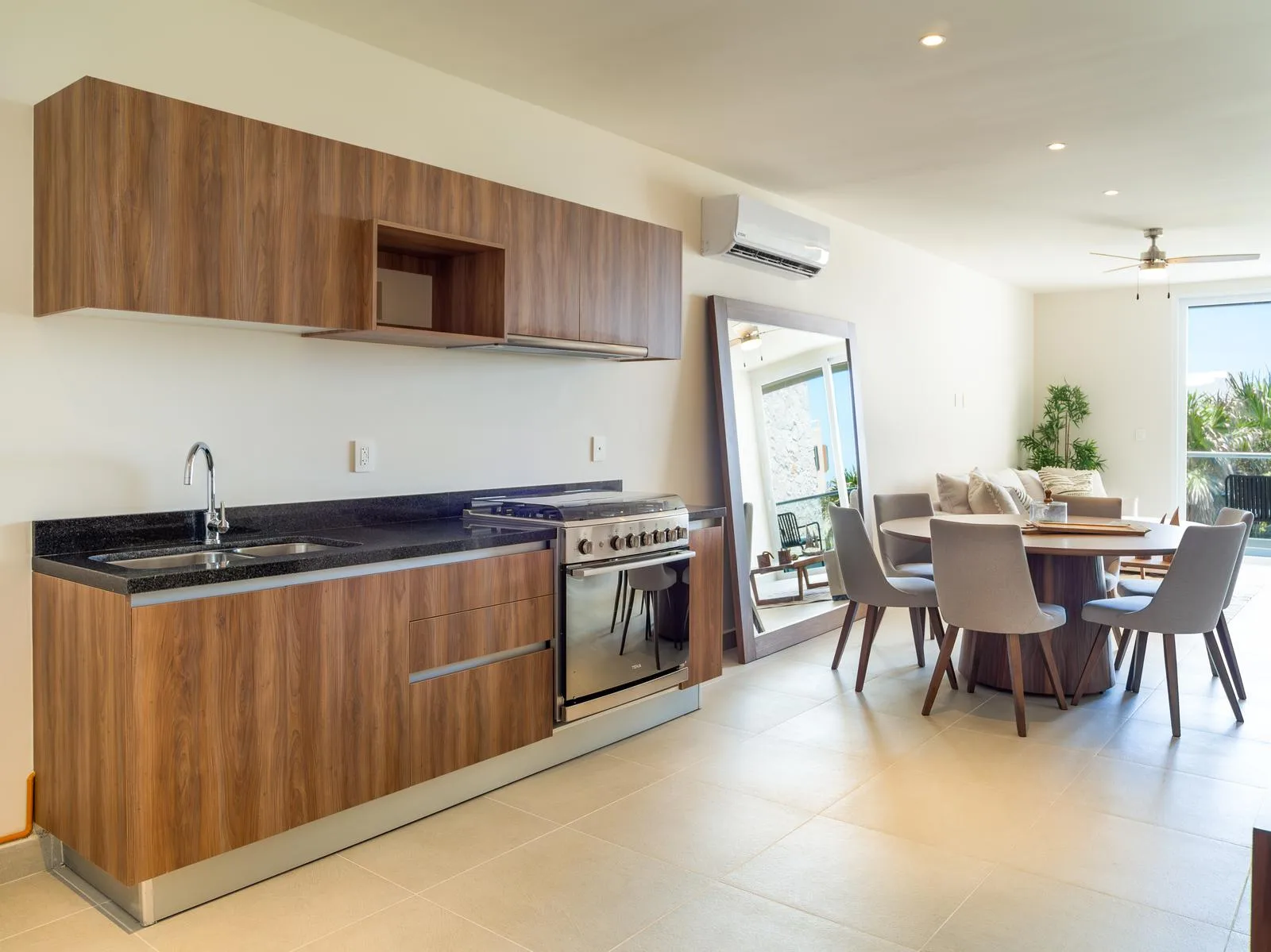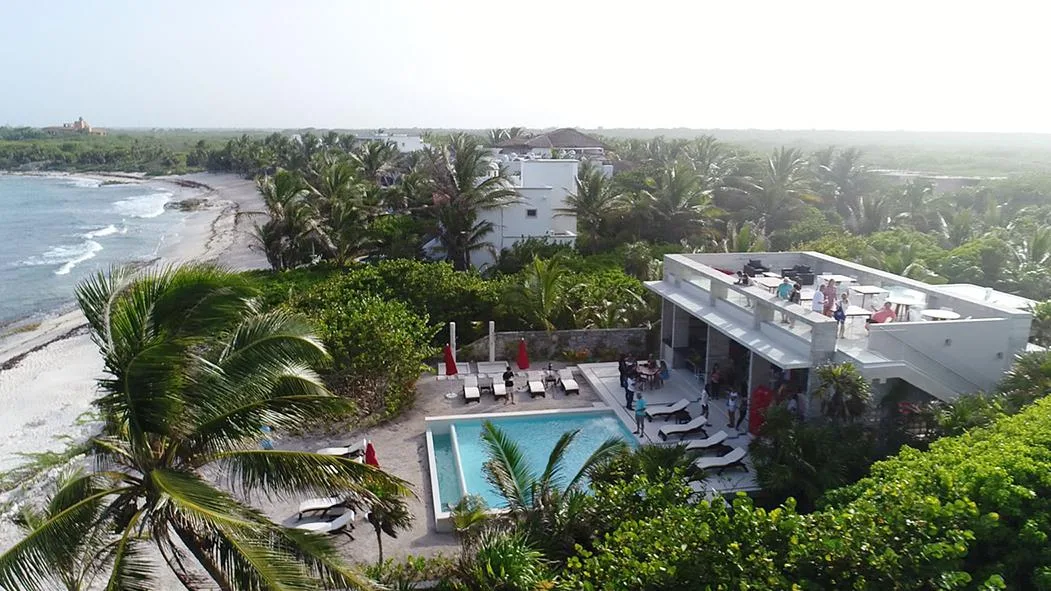 This two-bedroom unit with a lock-off is available for immediate delivery. It offers views of the sea and is part of a new, unique development just steps from the beach in Akumal. The development features a private beach club and is located approximately 15 minutes from Tulum.