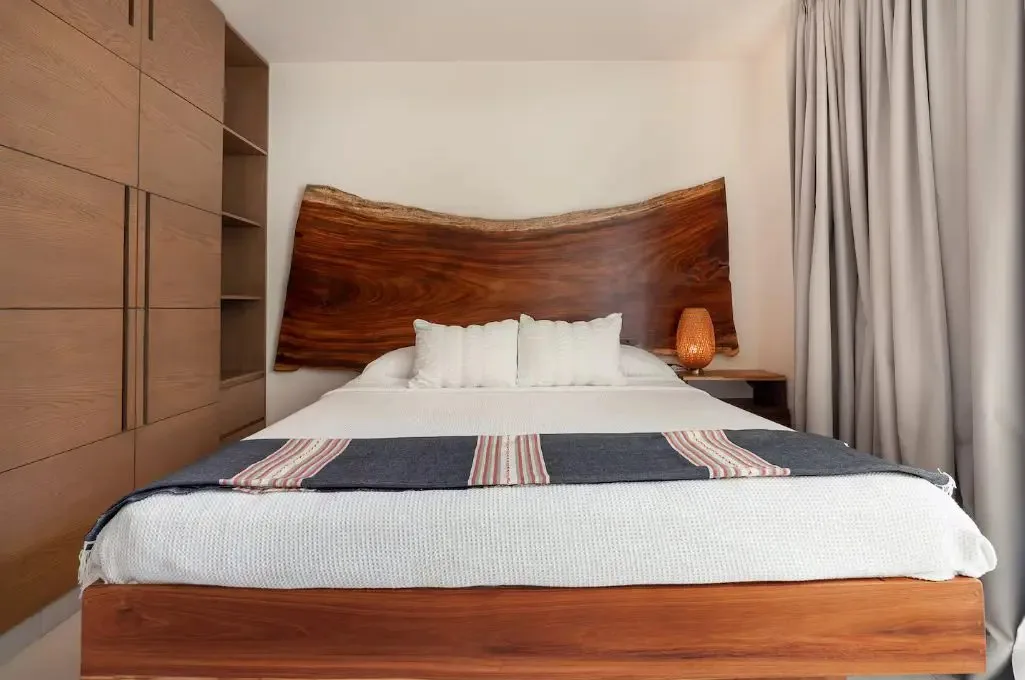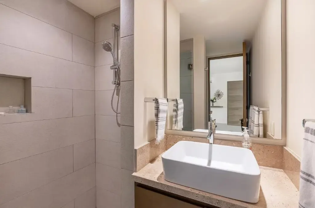 Community amenities include ten rooftop pools, a beach club, access to a secluded beach, BBQ areas, a gym, a yoga area, and 24/7 security.