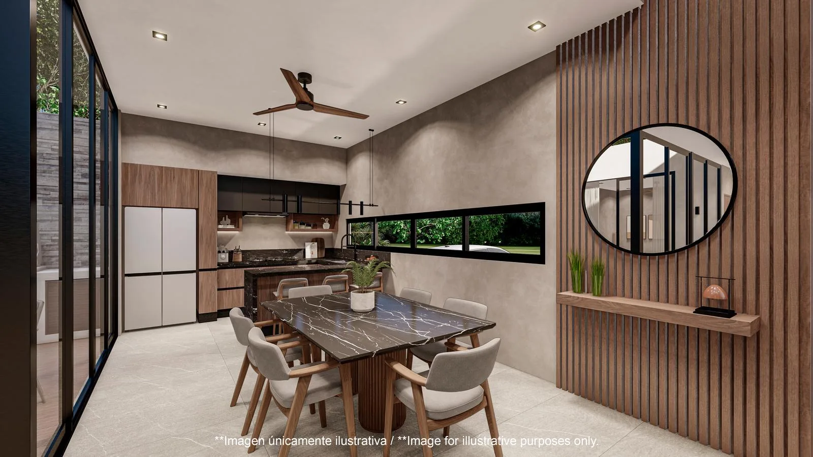 The property features a spacious living room with excellent natural light. An elegant dining room offers views of the green areas. The kitchen is fully equipped, functional, and modern.