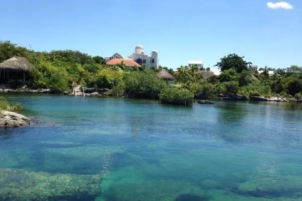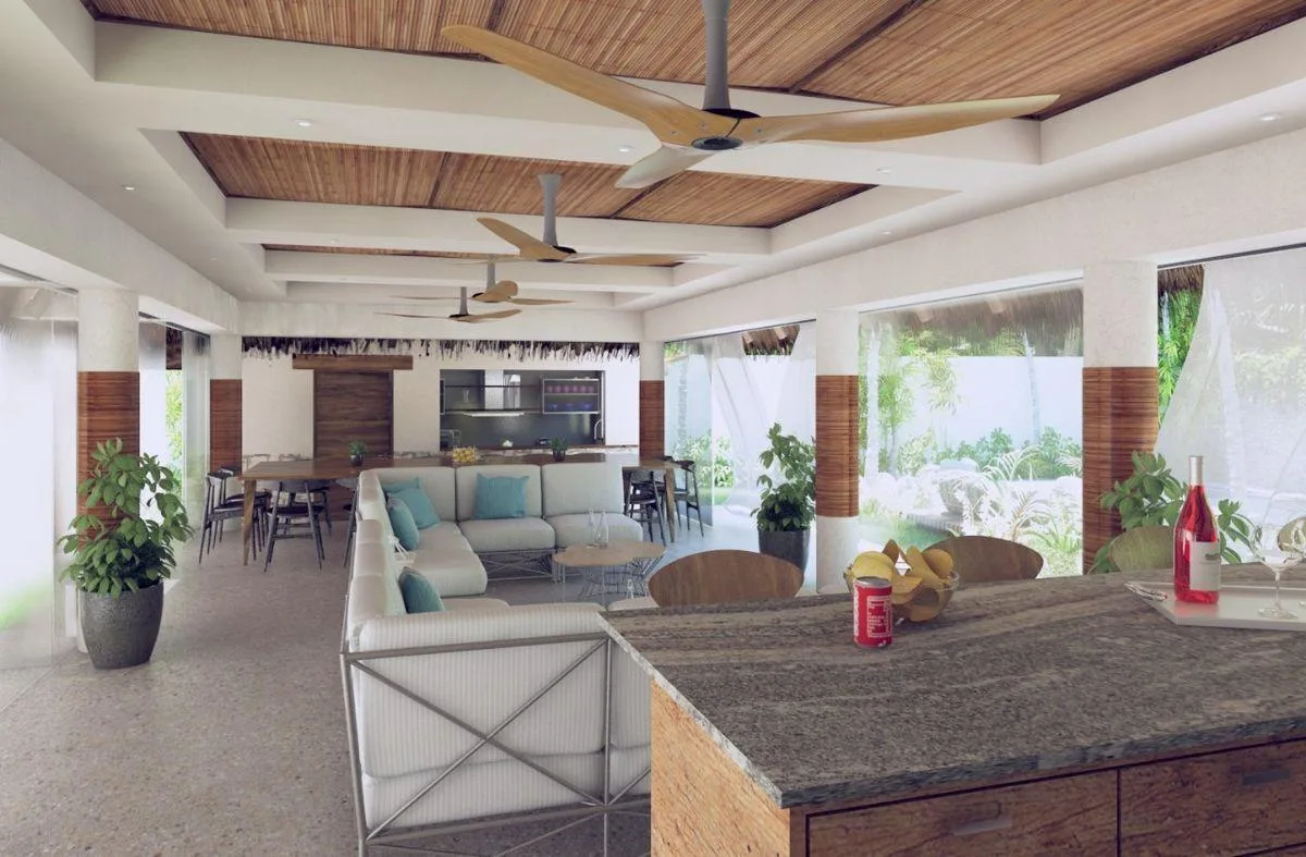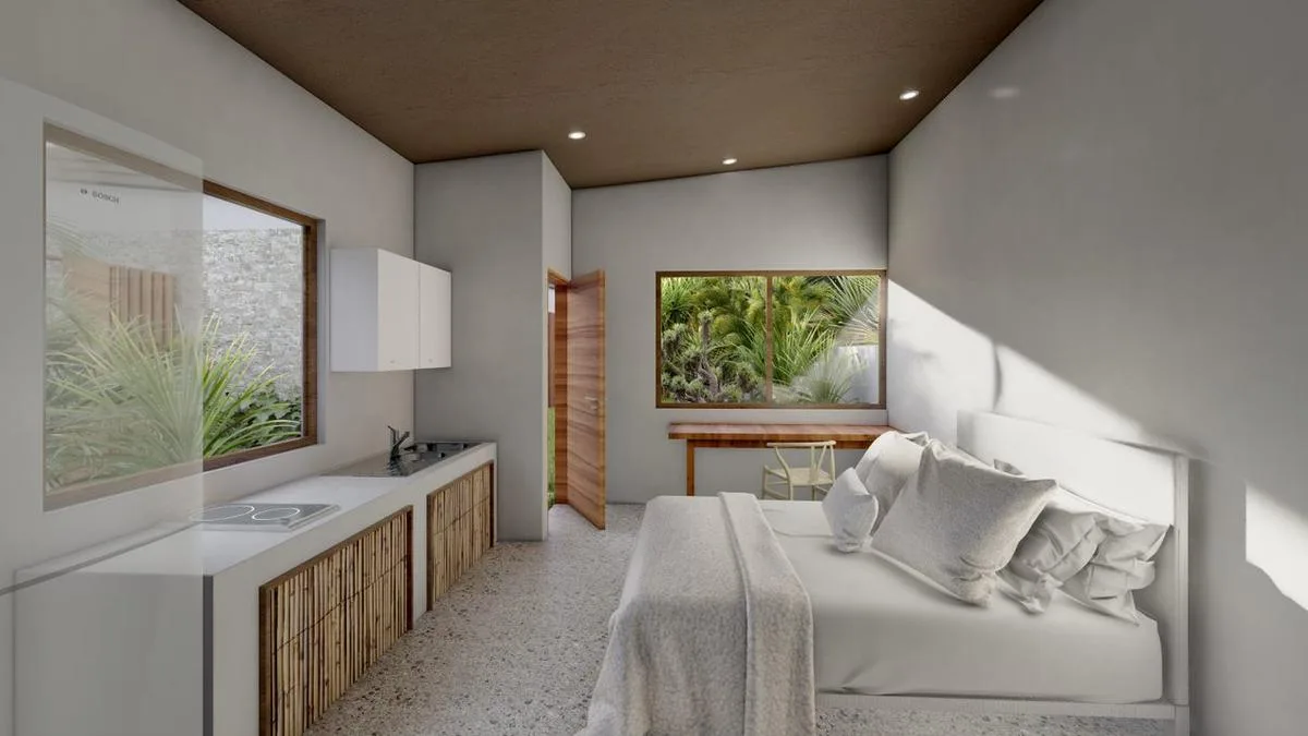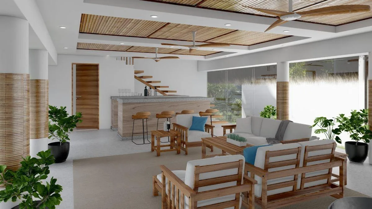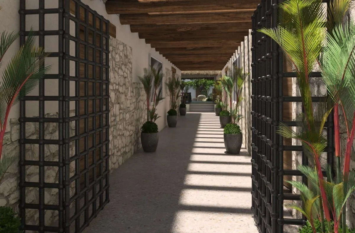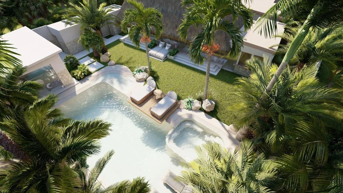 Upstairs, there is a palapa configured as a living area and another designated for massages. The property can accommodate approximately 16 people. The residential community also includes two natural cenotes within its green areas.