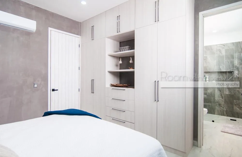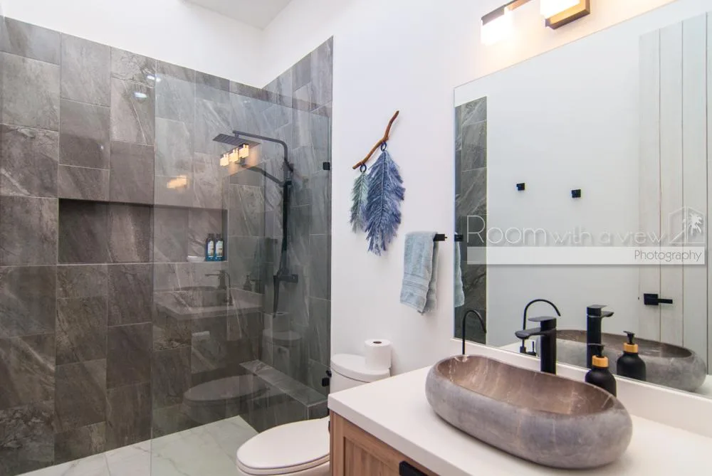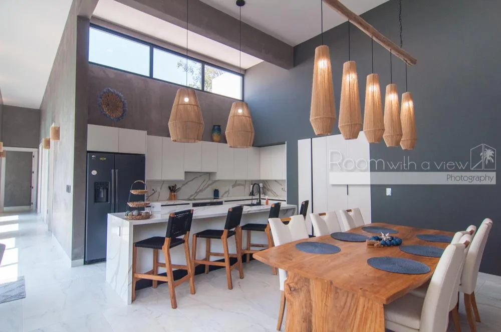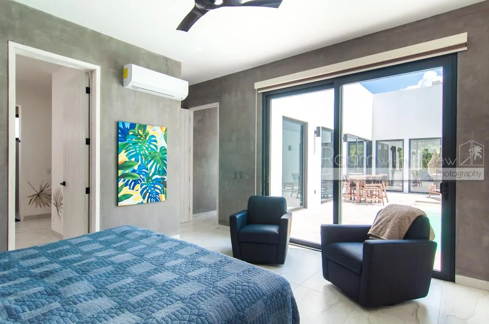 This single-story home features three spacious bedrooms and three and a half bathrooms. Large windows and sliding glass doors fill the interiors with natural light. An open-concept layout includes a bright living space that flows into a fully equipped kitchen with an island, high-end appliances, and ample storage.
