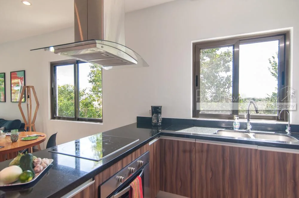 The property includes two balconies and offers jungle views. It is furnished and features a rooftop camera, solar power, and Starlink satellite internet. Green areas and a community pool are available within the community.