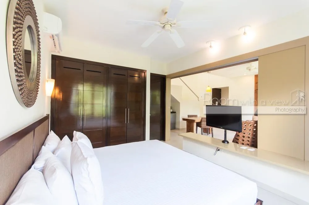 This studio-style unit features one bedroom and one bathroom. It has an open floor plan with a kitchenette and a retractable wall that separates the living and dining area from the bedroom. The condo includes tile floors and high-quality, durable finishes. It is fully furnished and equipped with ceiling fans, air conditioning, and a bedroom closet.