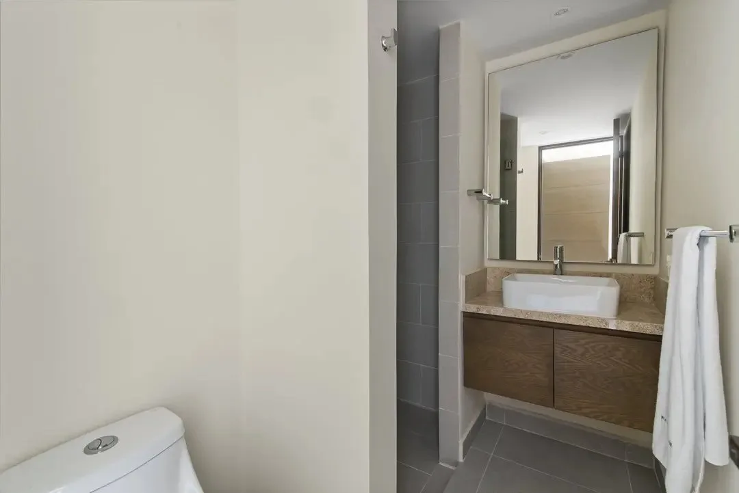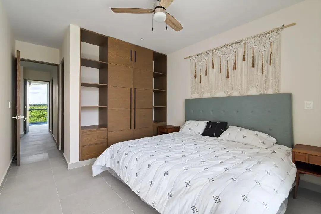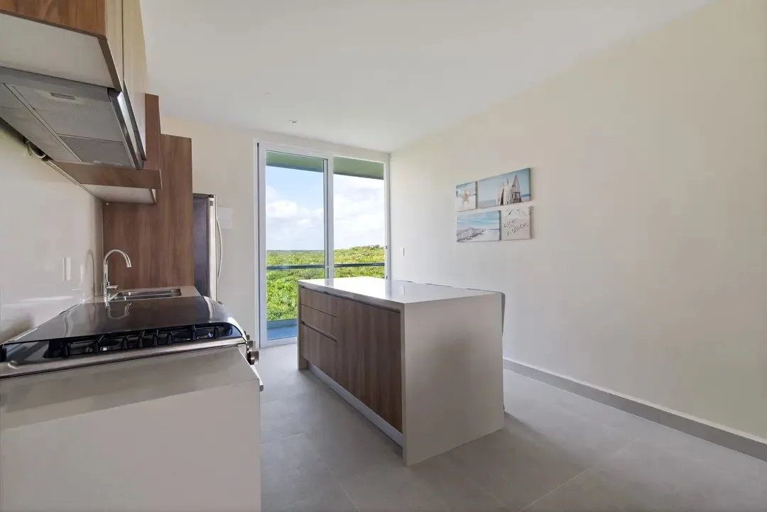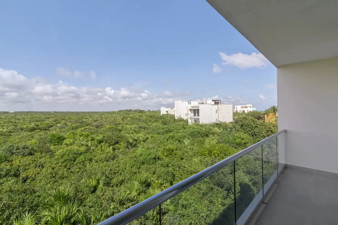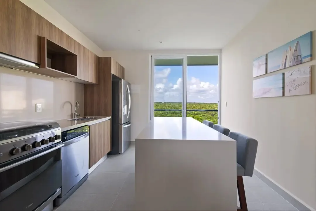 Building amenities include two swimming pools, seven common rooftops with ocean views, a BBQ area, a lounge area, a gym, and a yoga area. A wellness center and a jungle beach club are located nearby.