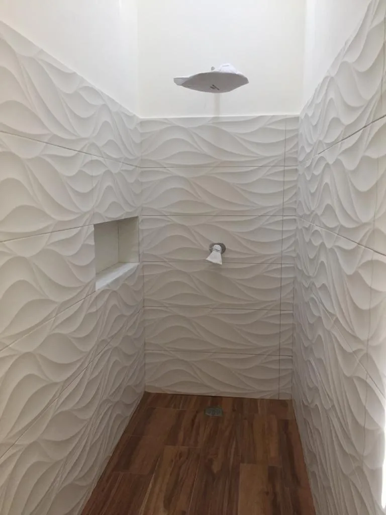 It features two bedrooms and three bathrooms. The layout includes a living room and kitchen, a laundry room, and a parking space. Porcelain tile floors are installed throughout the entire house.