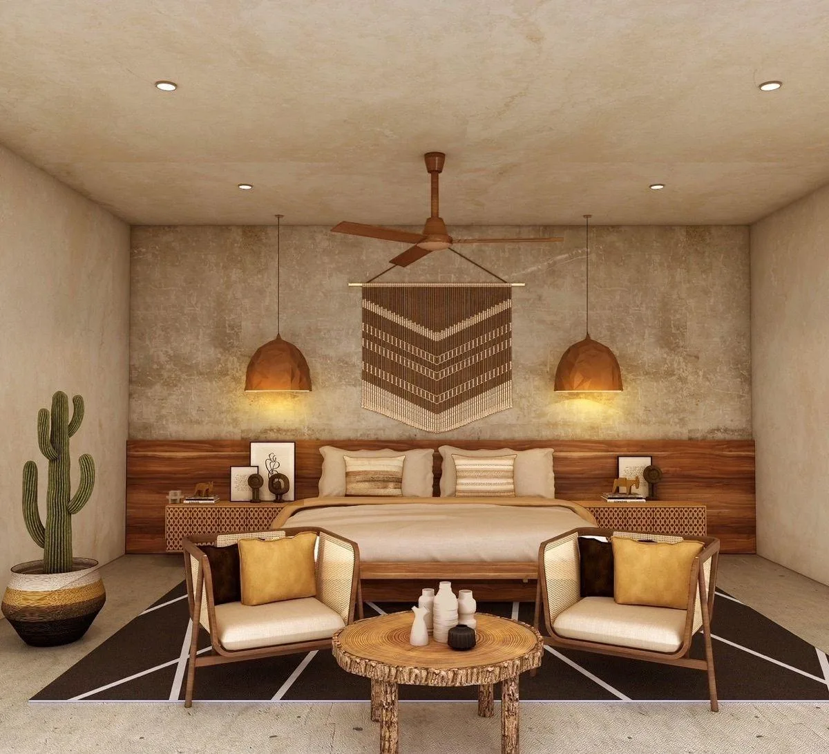 These sustainably designed villas feature 3 bedrooms and 3 bathrooms. They have a spacious open-plan layout with a fully equipped kitchen including an island and premium appliances, and a bright living and dining area. The decor is bohemian-style with locally sourced materials such as chukum and Tzalam woods. The master bedroom includes a small sitting area and a luxurious master bath with a double vanity, a hot tub, and a separate walk-in shower. Floors are polished cement, and finishes are high-quality natural materials that are durable and easy to maintain. The villas are unfurnished but equipped with ceiling fans and air conditioning.