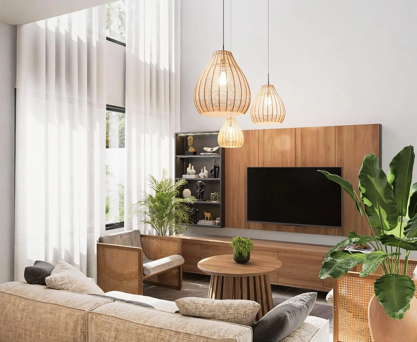 The villa's layout features three spacious and well-lit bedrooms and three full bathrooms plus one half bathroom. The living room offers views of the garden. The home includes a functional open-concept kitchen and a separate laundry area.