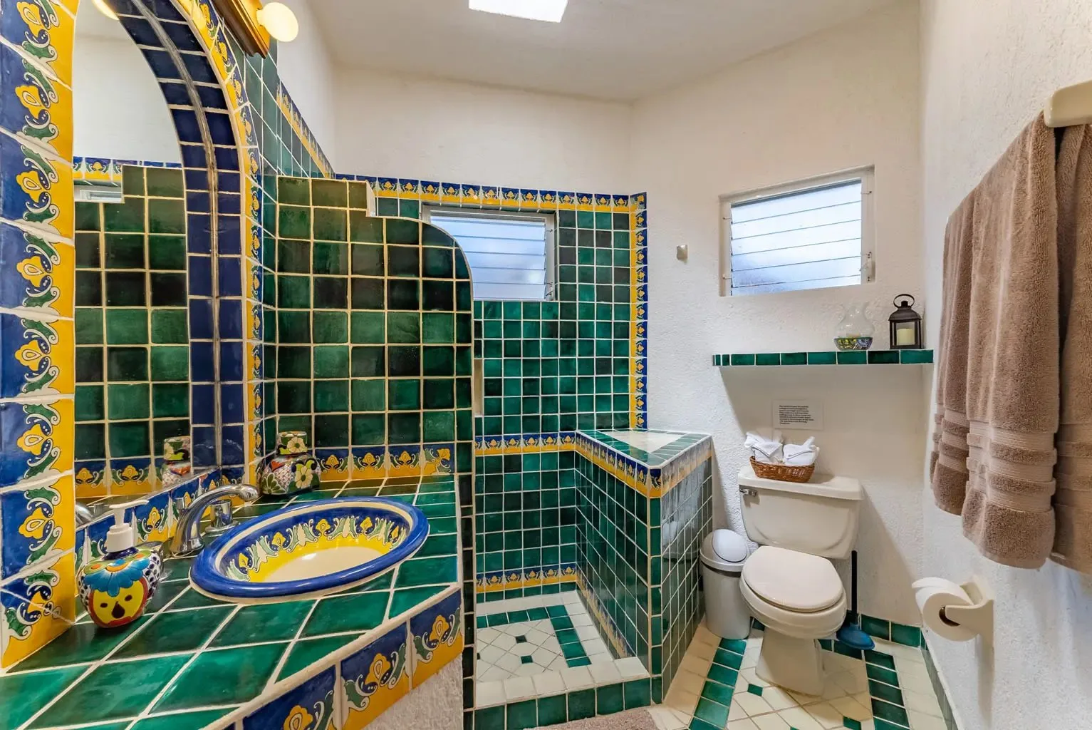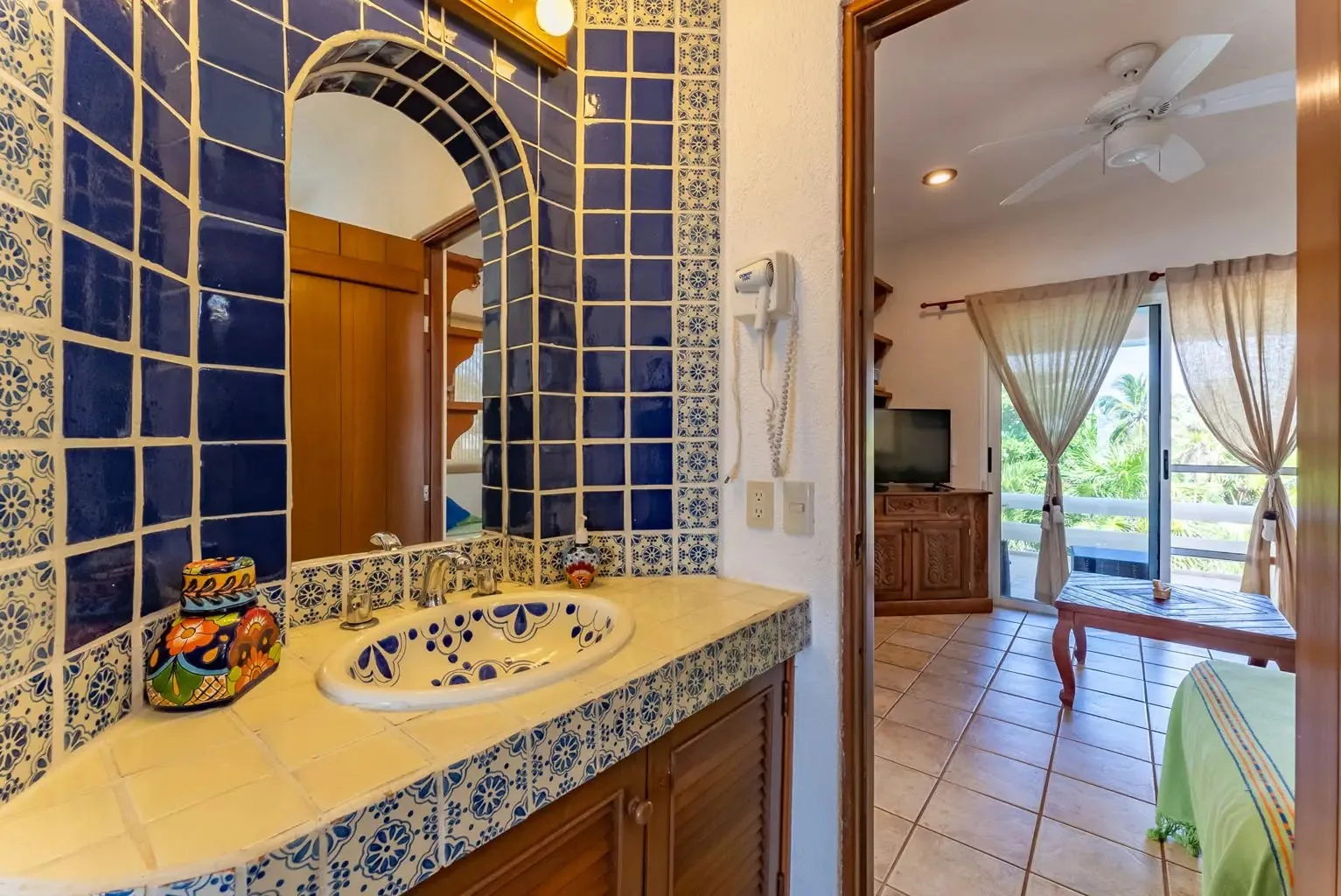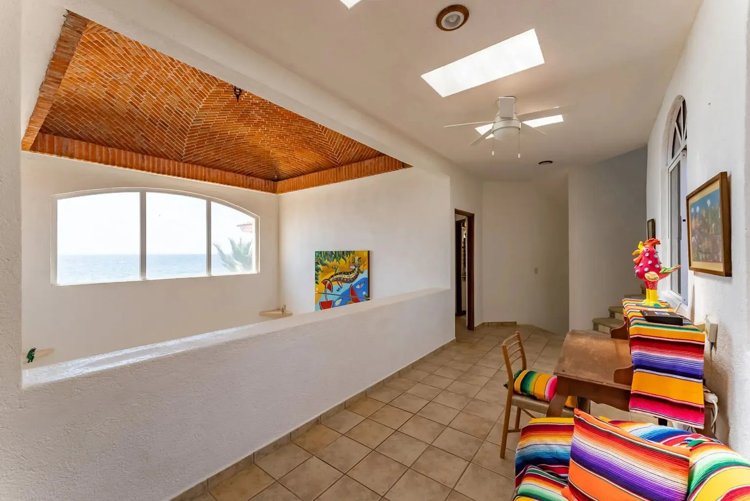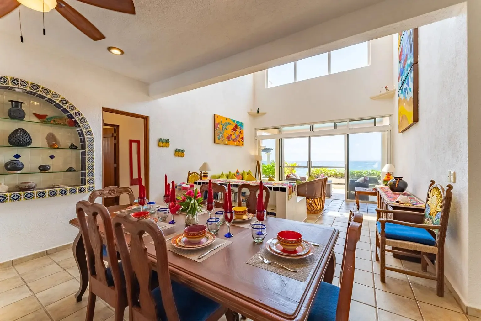 The villa is a unique creation designed and built by a noted Mexican-Yucatecan architect and visual artist. Casa Dos Palmas is an exceptional combination of Mayan architecture, featuring a three-story, handcrafted Mayan dome (a brick cupula) and original Talavera tiles in an authentic hacienda style. The furniture is handcrafted, and there are mahogany closets. Original art and murals are another highlight, as the house retains its two original commissioned murals. The property offers unparalleled 180-degree ocean and sunrise views with jungle surroundings by the pool. A locked owner's cabinet serves as a snack and liquor cabinet. Bedrooms include safes for securing personal items.